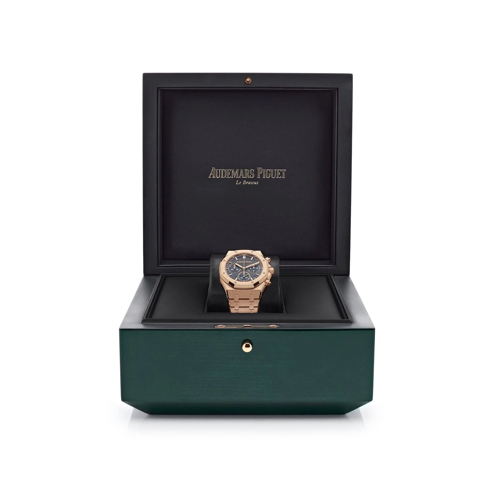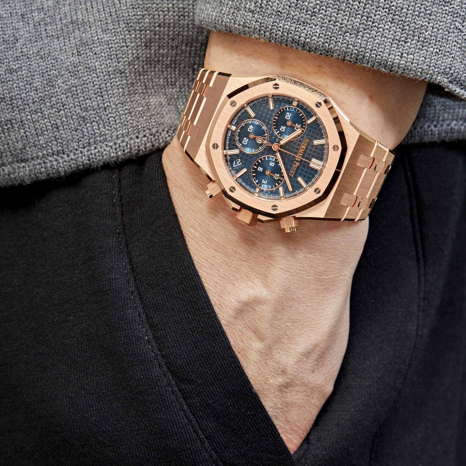 Introducing the Audemars Piguet Royal Oak Selfwinding Chronograph 26240OR.OO.1320OR.05. The 41mm case is made of 18k rose gold and complements the Grande Tapisserie dial in Blue. Luminescent rose gold hand and hour markers work with the Sapphire glare-proofed crystal for optimal legibility in any condition. An exhibition case back gives a glimpse at the Calibre 4401 in action. powering all of the watch’s complications. including Flyback chronograph timekeeping and date features.