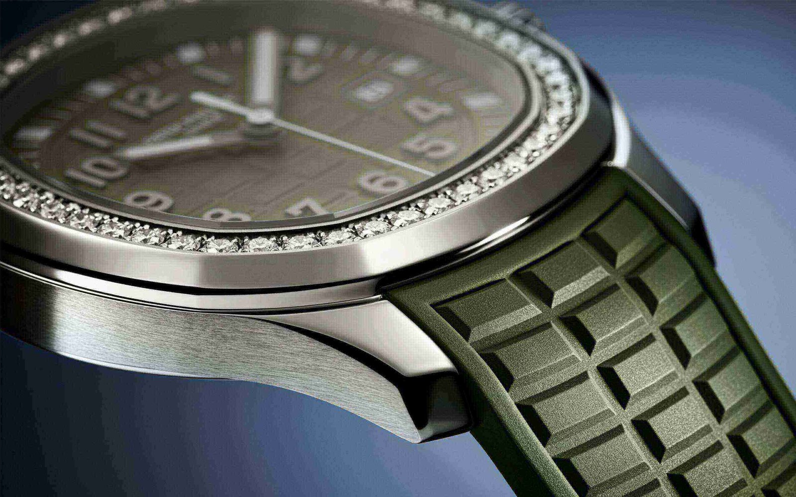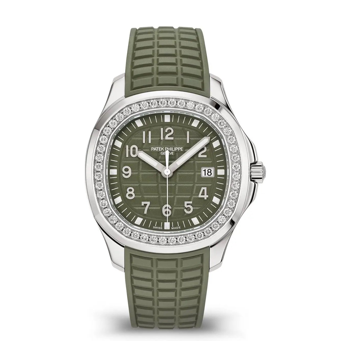 Patek Philippe reinterprets the quartz Aquanaut Luce in stainless steel with a larger diameter (38.8 mm) and a new integrated composite strap. This epitome of contemporary casual chic is attired in a bold khaki-green color adorning the dial and matching strap. Water-resistant to 30m, the rounded octagonal case is enhanced by polished and satin finishes. The bezel is lit up by a row of 48 diamonds (~1.11 ct). The patented folding clasp is secured by four independent catches.