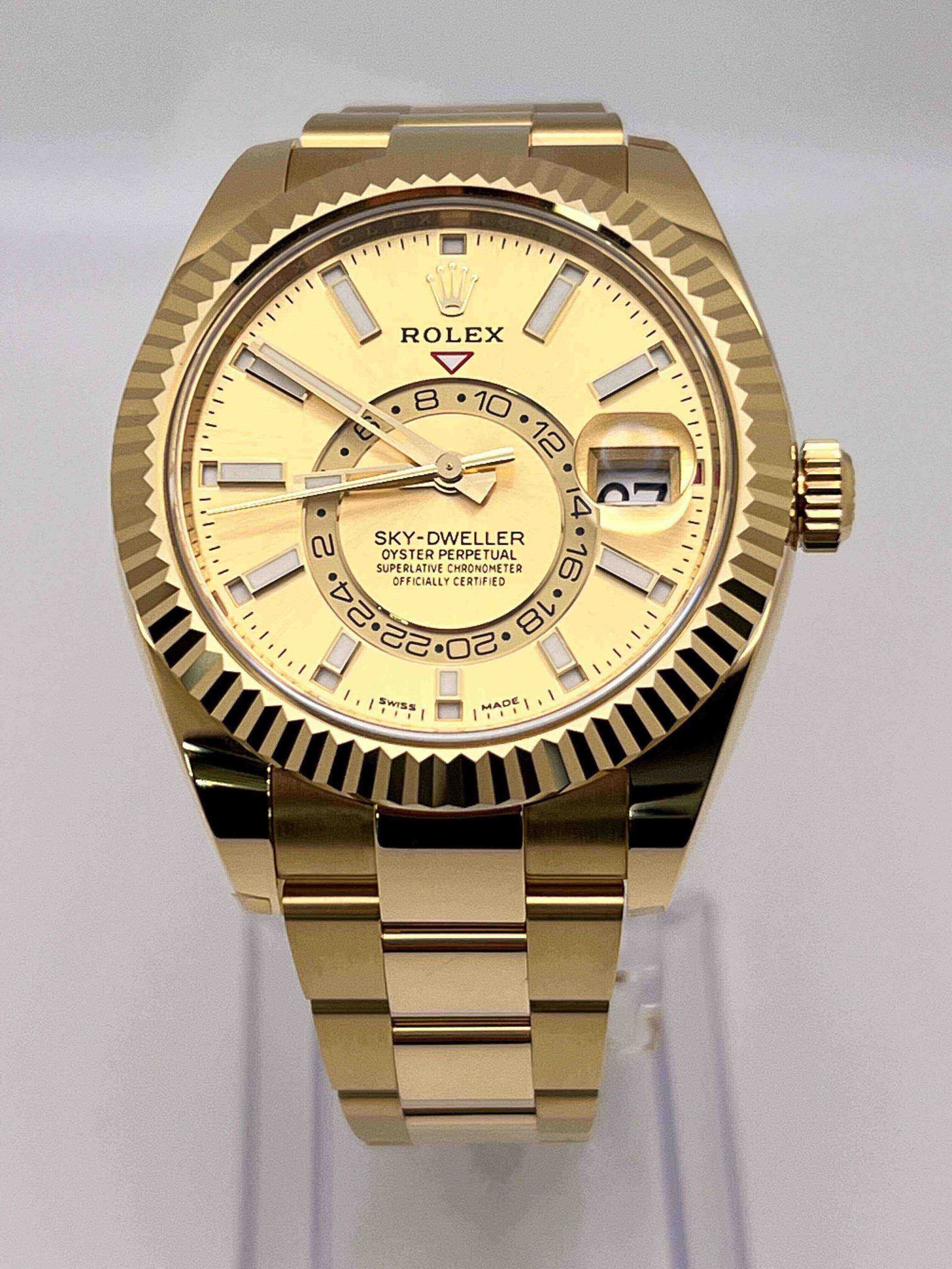 The Rolex Sky-Dweller features dual time zones. inlaid in a 42mm yellow gold case with the signature fluted bezel. It surrounds a champagne-gold dial with luminous. white hour markers. This watch isfinished with a yellow gold Oyster bracelet.