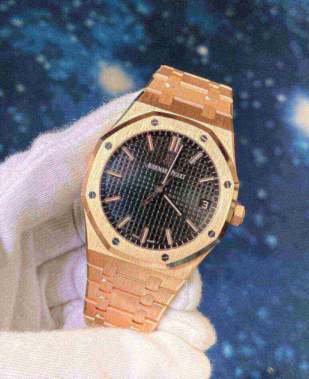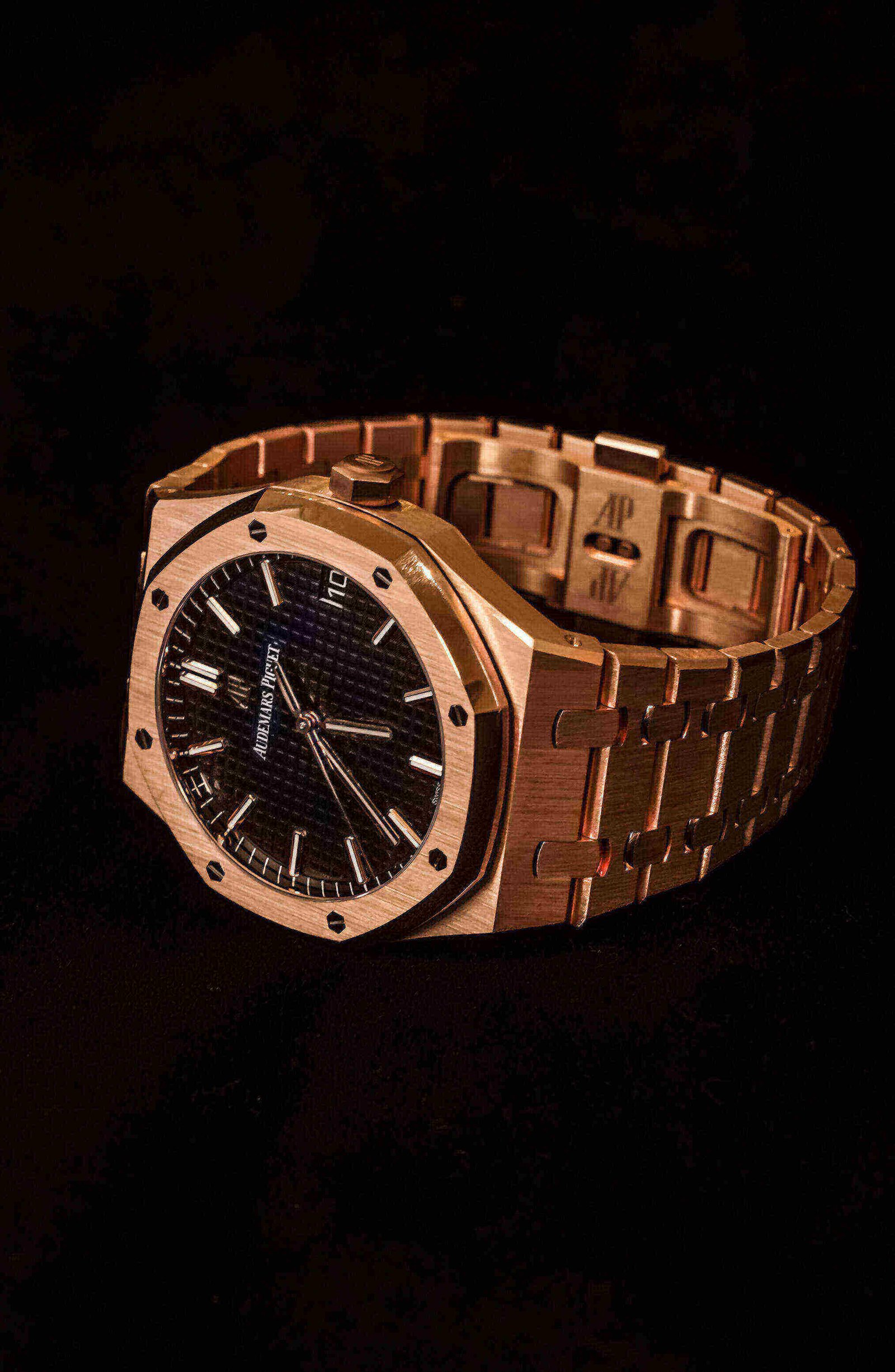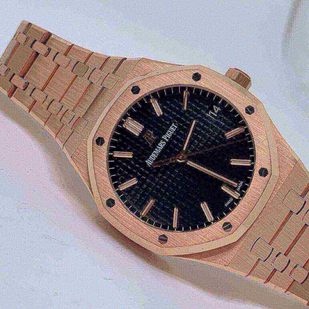 AP Royal Oak Selfwinding. 41mm with brushed finished 18k Rose Gold case with polished beveled corners. Black dial with the Grande Tapisserie design pattern. Polished Rose Gold hands. the hour and minute hands with luminous fill. Applied polished rose gold index hour markers with luminous fill. Fine printed minute and seconds track on the dial flange. Date window at 3 o’clock. This model has an 18k Rose Gold screw-locked crown and transparent sapphire crystal case back. A Scratch-resistant glare-proofed sapphire crystal protects the watch dial. Brushed and polished fixed 18k Rose Gold octagon-shaped bezel. secured by 8 polished hex-head screws. The movement is mechanical self-winding AP in-house caliber 4302. contains 32 jewels. and has an approximate power reserve of 70 hours. The watch is presented on an 18k Rose Gold Integrated bracelet with an AP folding clasp.
