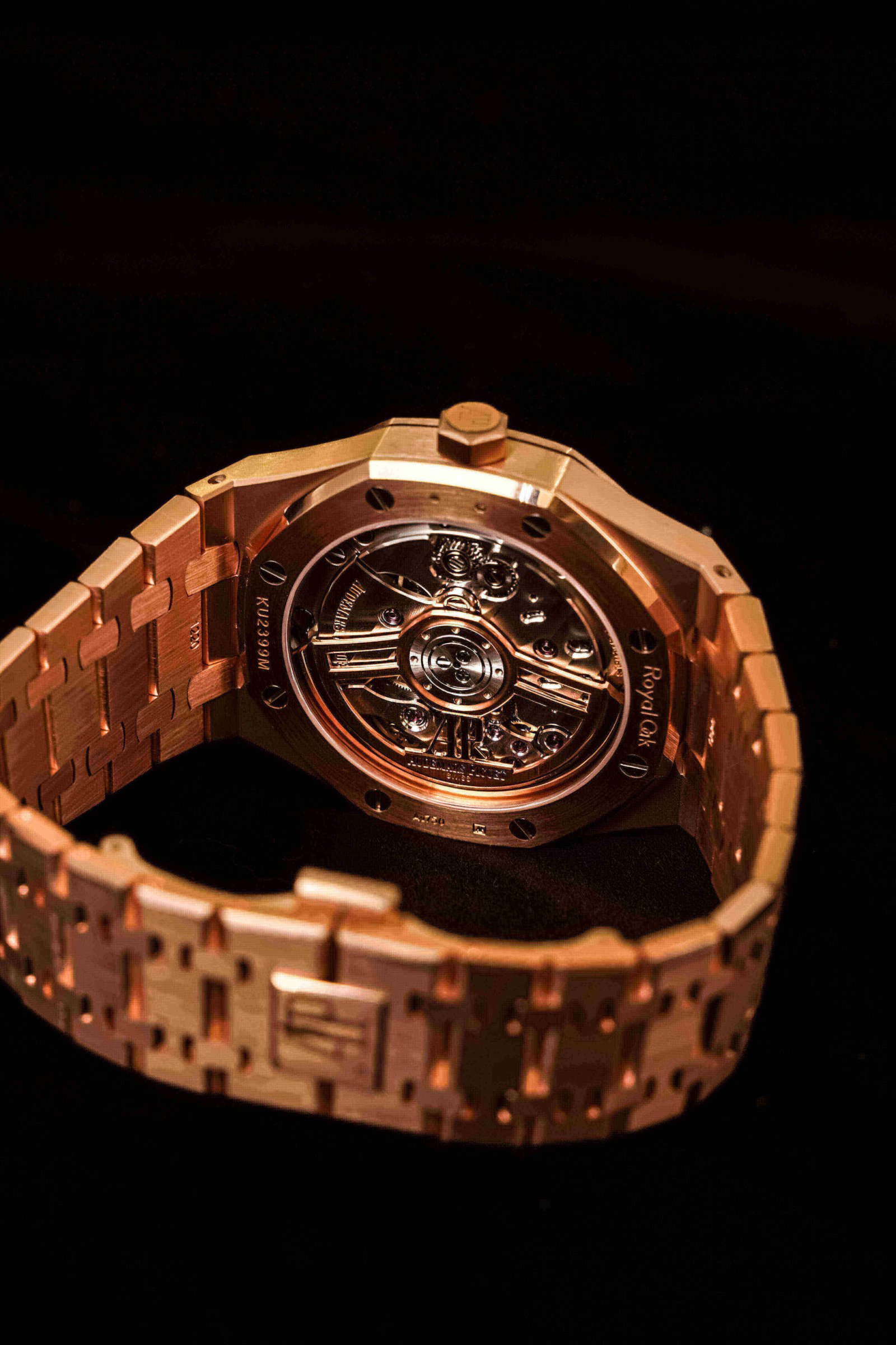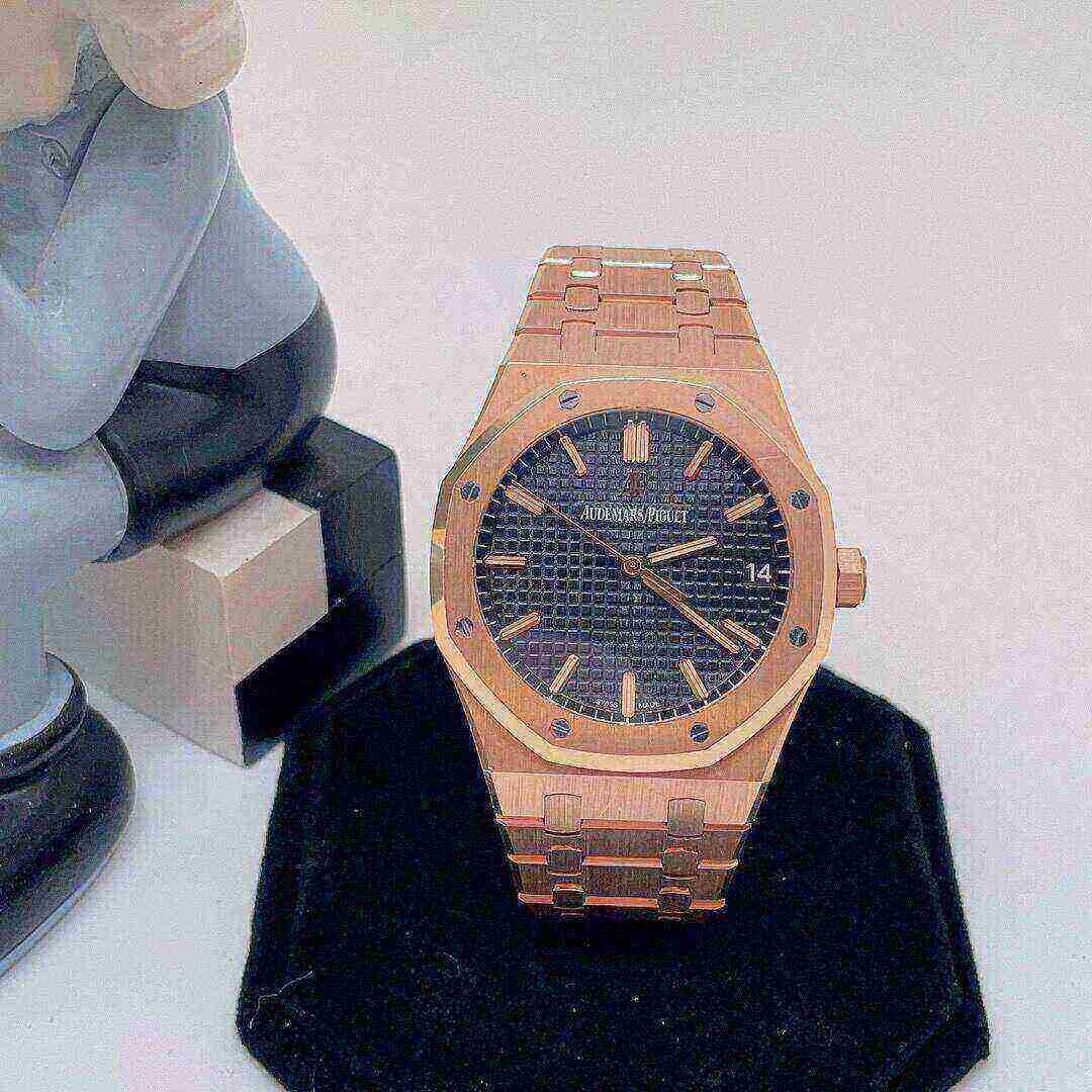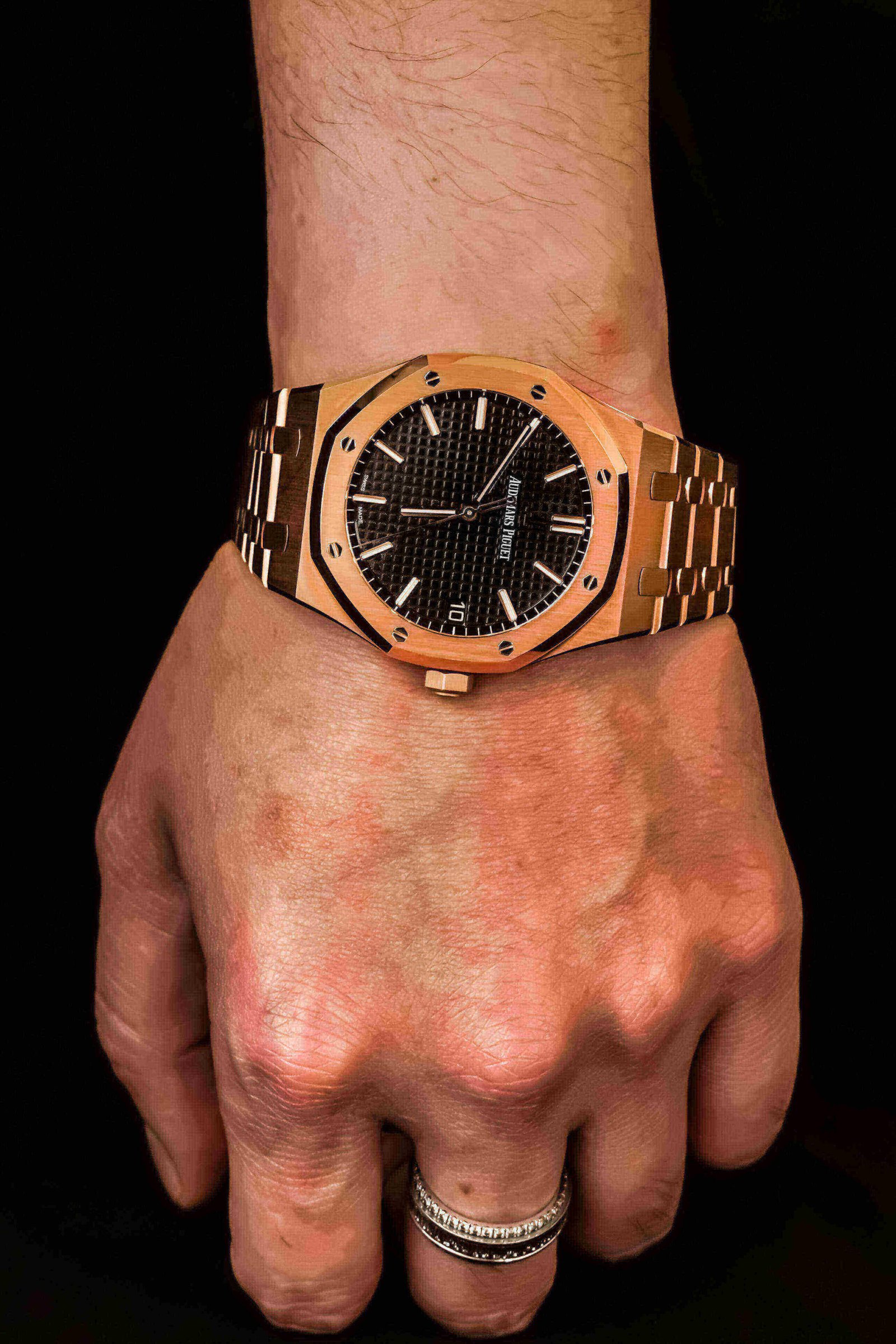 AP Royal Oak Selfwinding. 41mm with brushed finished 18k Rose Gold case with polished beveled corners. Black dial with the Grande Tapisserie design pattern. Polished Rose Gold hands. the hour and minute hands with luminous fill. Applied polished rose gold index hour markers with luminous fill. Fine printed minute and seconds track on the dial flange. Date window at 3 o’clock. This model has an 18k Rose Gold screw-locked crown and transparent sapphire crystal case back. A Scratch-resistant glare-proofed sapphire crystal protects the watch dial. Brushed and polished fixed 18k Rose Gold octagon-shaped bezel. secured by 8 polished hex-head screws. The movement is mechanical self-winding AP in-house caliber 4302. contains 32 jewels. and has an approximate power reserve of 70 hours. The watch is presented on an 18k Rose Gold Integrated bracelet with an AP folding clasp.