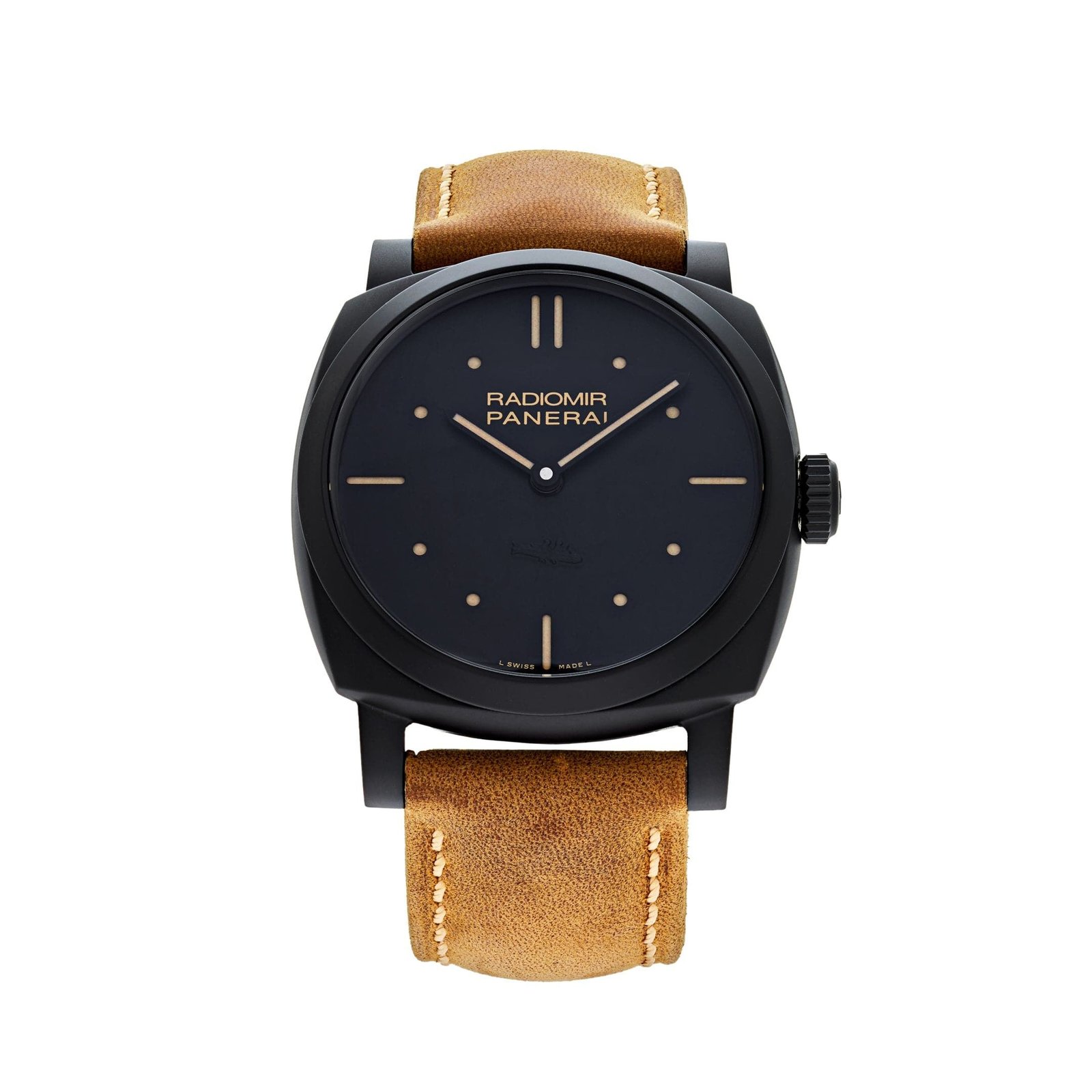 This Panerai Radiomir 1940 is crafted in a black ceramic case measuring 48mm with a DLC titanium caseback.The black dial is totally refined to represent the entirety of the watch -simple. clean. and functional. The subtle markers in dot and bar style are also coated with Super-LumiNova for optimum visibility.The Radiomir uses brown scamosciato with a trapezoidal buckle made of black DLC-coated titanium that perfectly blends with its dark look.