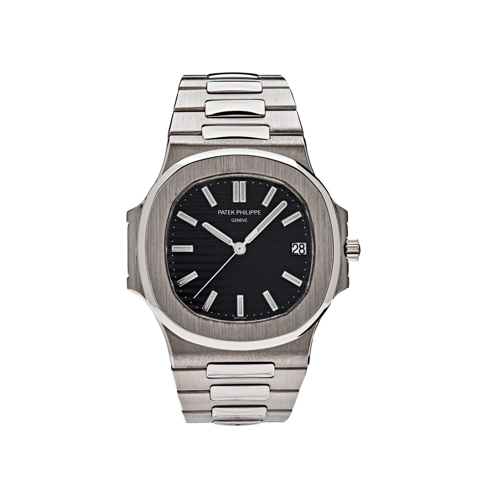 This Patek Philippe Nautilus watch keeps the same basic design appeal as the Jumbo Nautilus and is powered by the same automatic caliber 315.but has a slightly thicker case and sweep center seconds. The reference was first released in 2004 and was only produced for three years before being withdrawn in 2007. The watch features a white gold 42mm case. a black ribbed dial. a white gold fully linked bracelet and a sapphire case back.