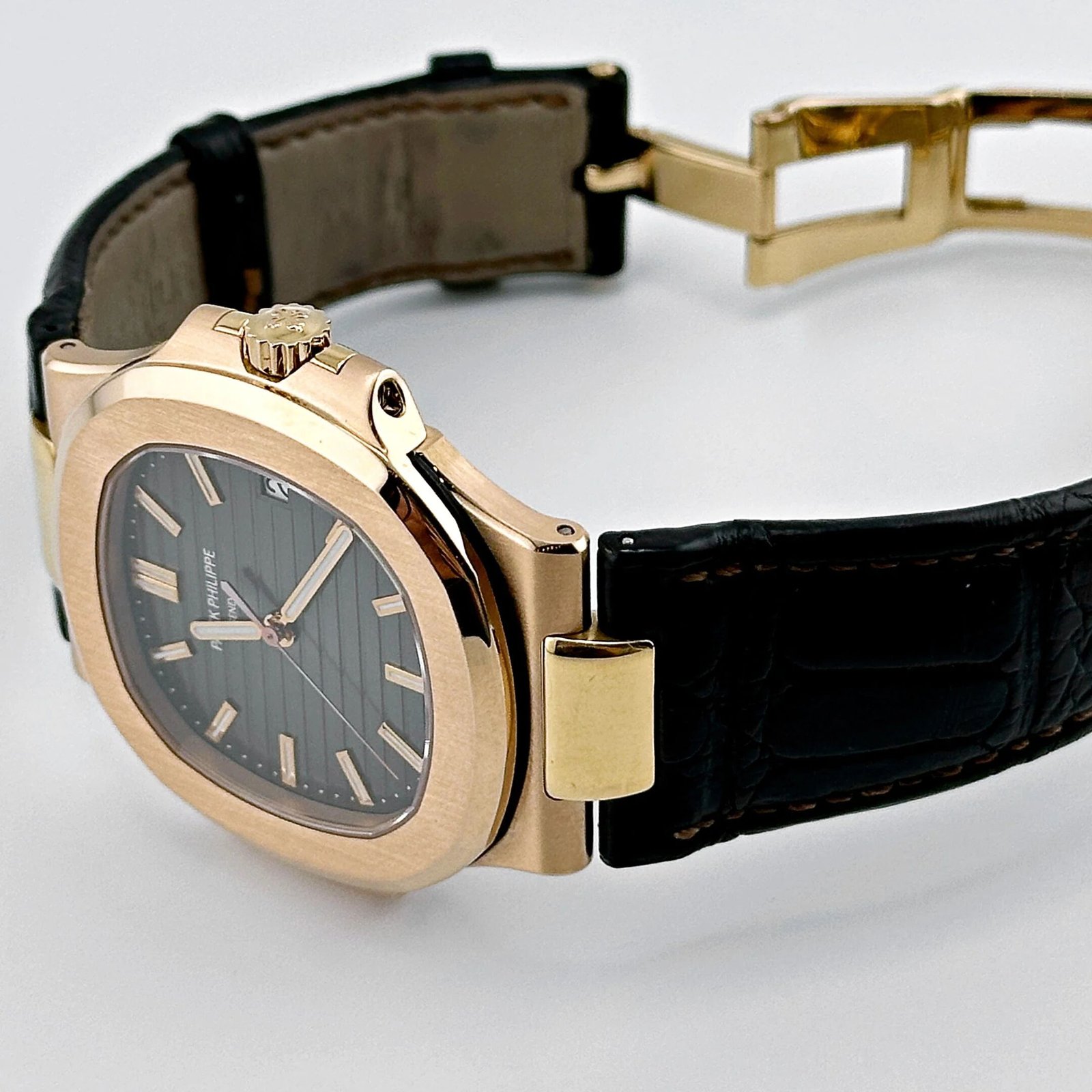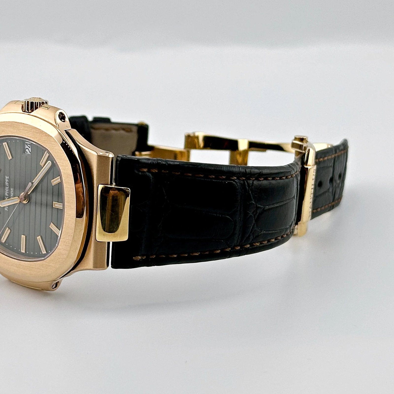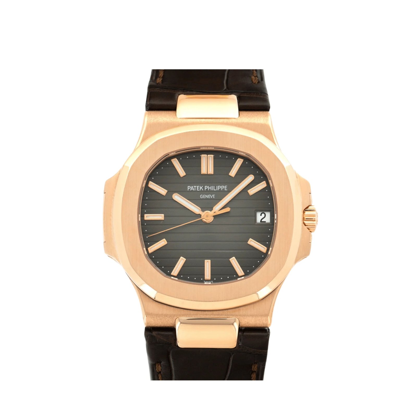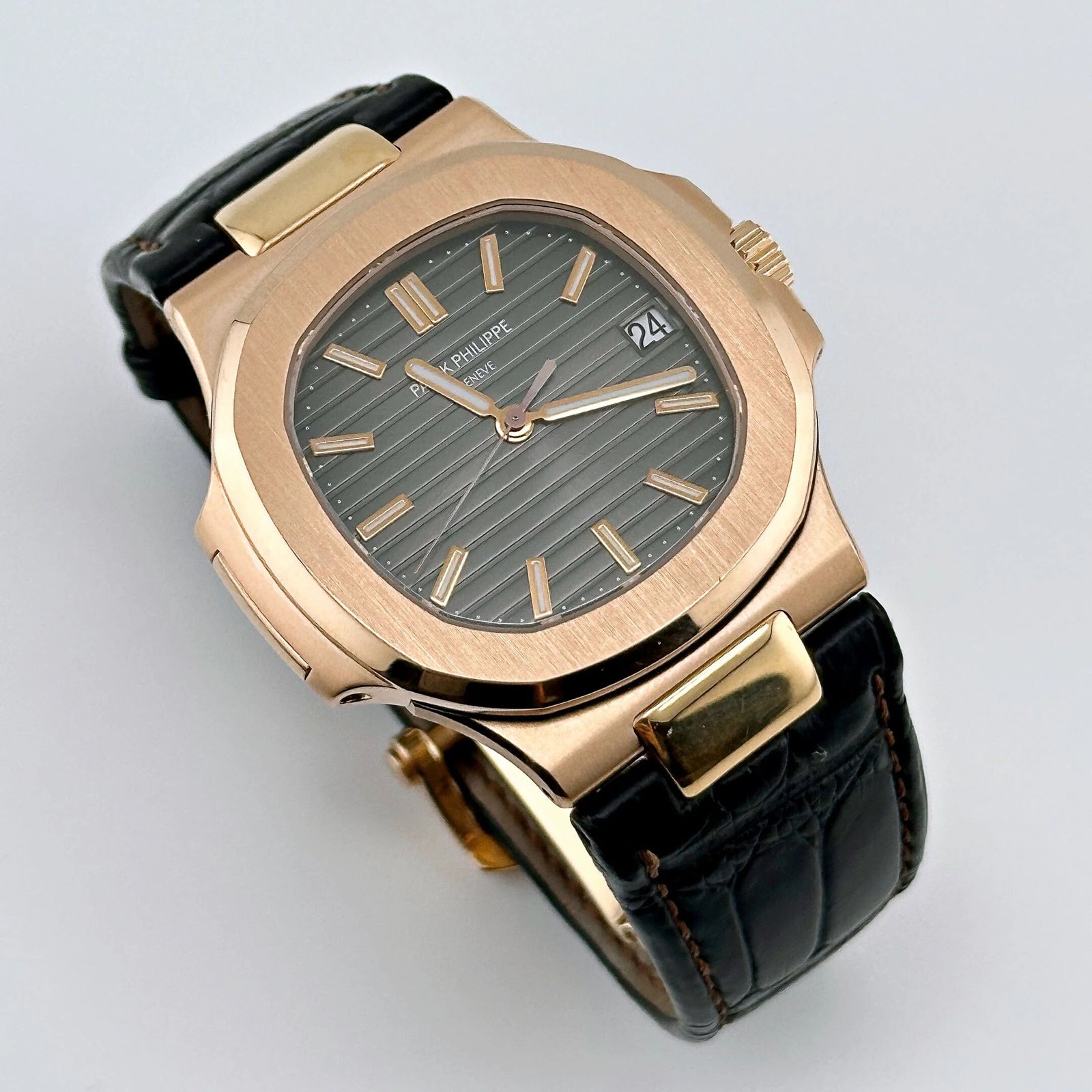 The Patek Philippe Nautilus 5711R-001 is a striking example of understated luxury. crafted in 18k rose gold. The iconic 40mm Nautilus case. with its rounded octagonal bezel and integrated bracelet. is finished with a blend of brushed and polished surfaces. creating a timeless yet contemporary aesthetic.