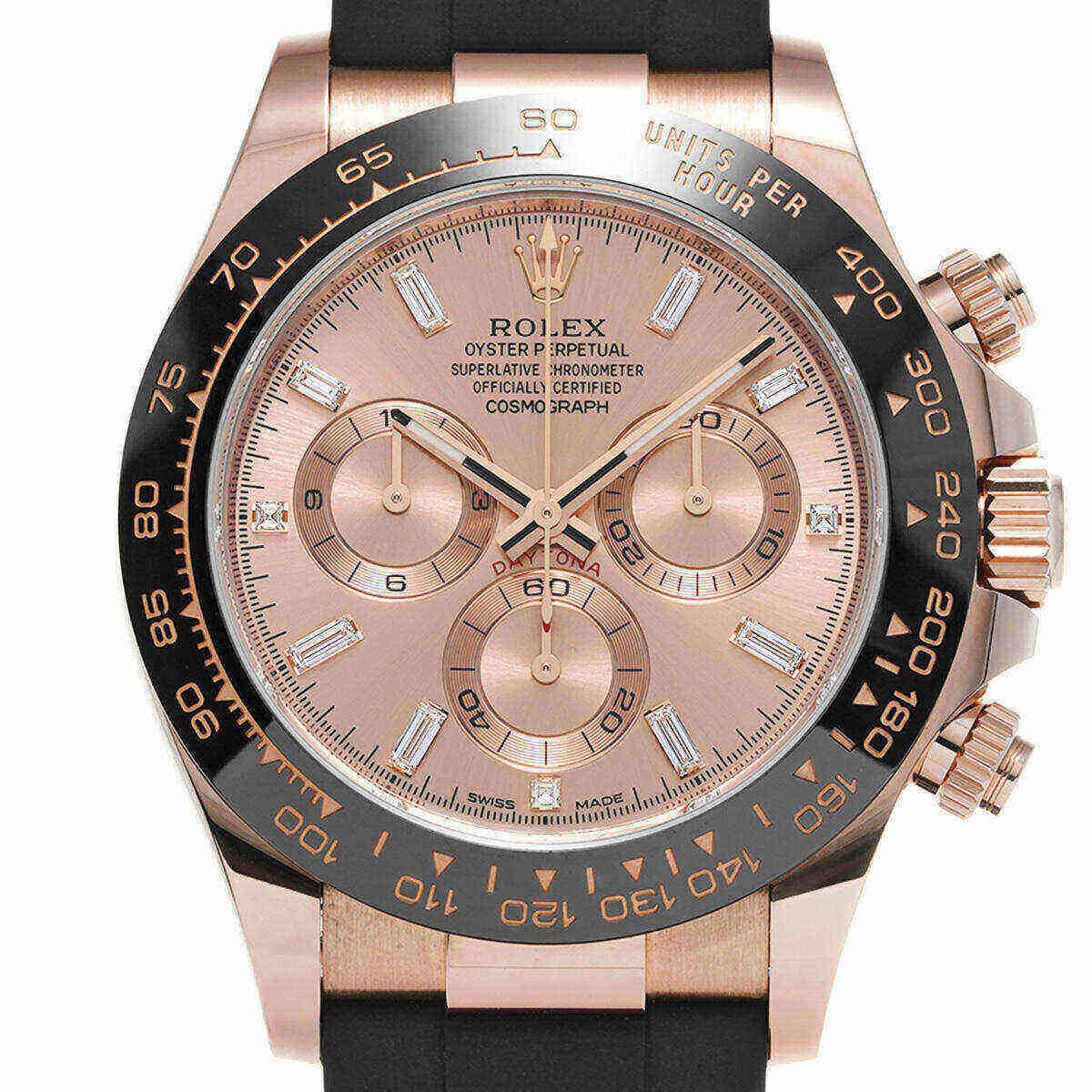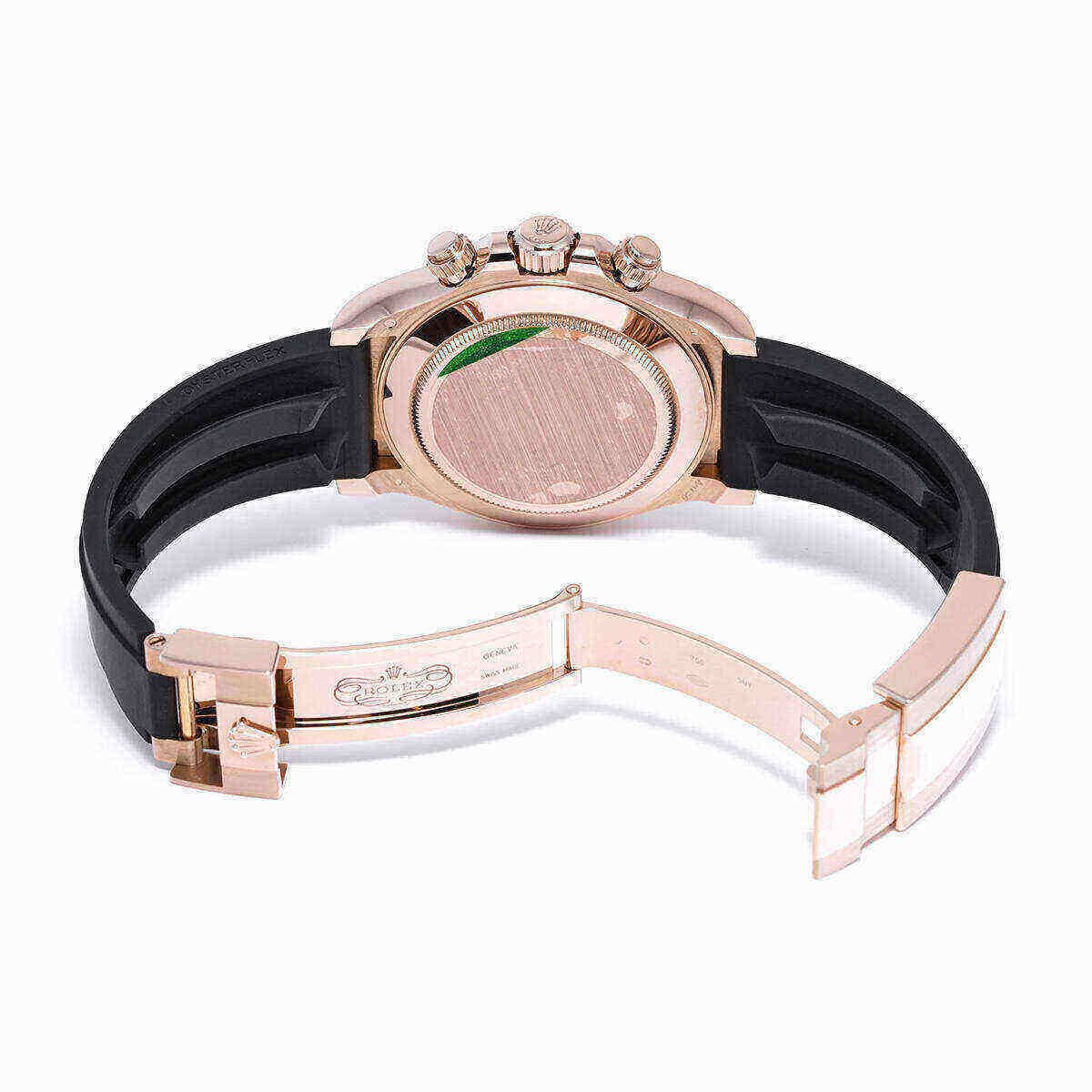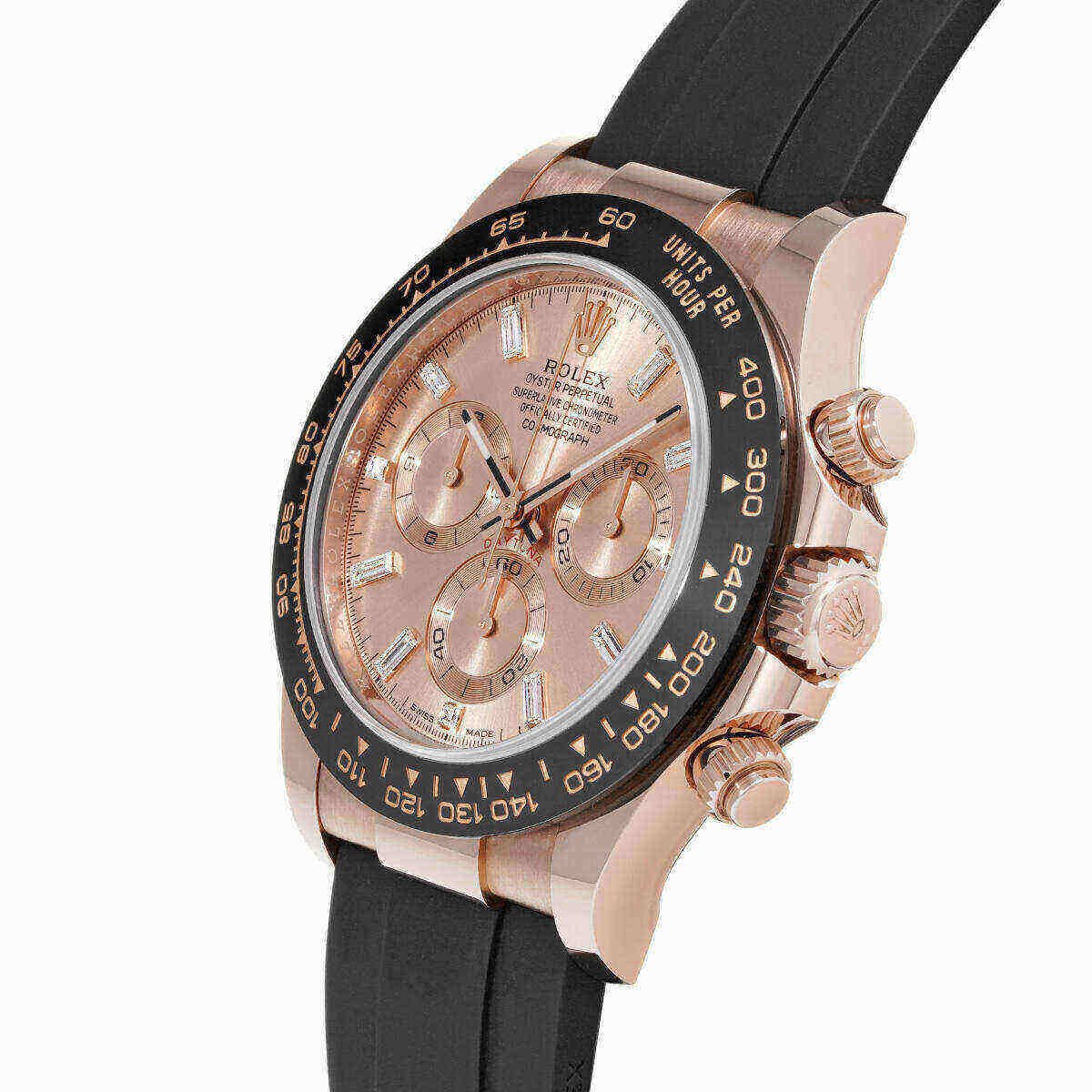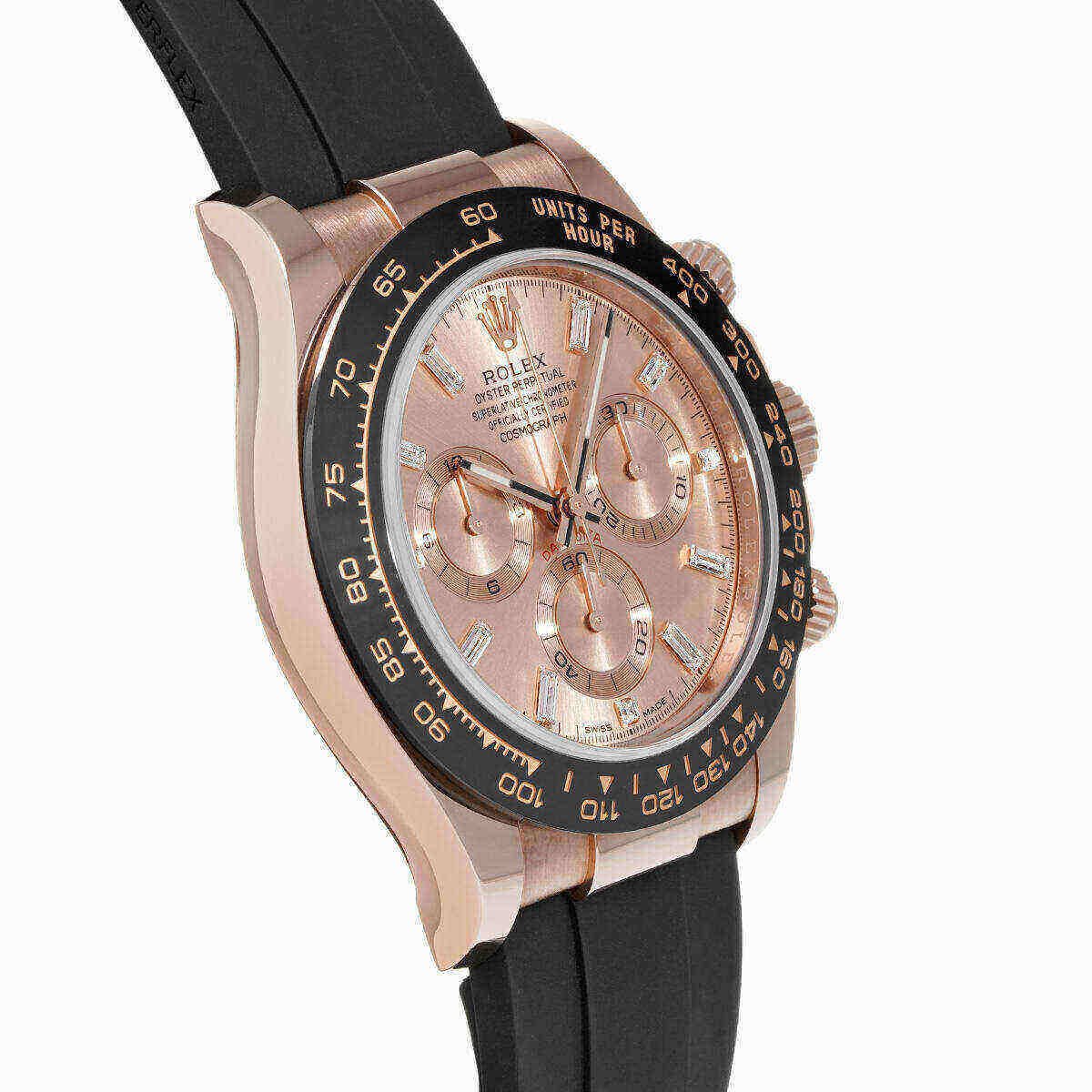 This Rolex Daytona 116515LN is designed in a 40mm 18k rose gold case, a ceramic bezel featuring a Tachymetric scale, and a shimmering rose gold dial with matching sub-dials. The hour markers and hands work with Chromalight display to provide optimal legibility. It is housed on a black rubber strap with a folding clasp. This watch is the pinnacle between form, function, and fashion.