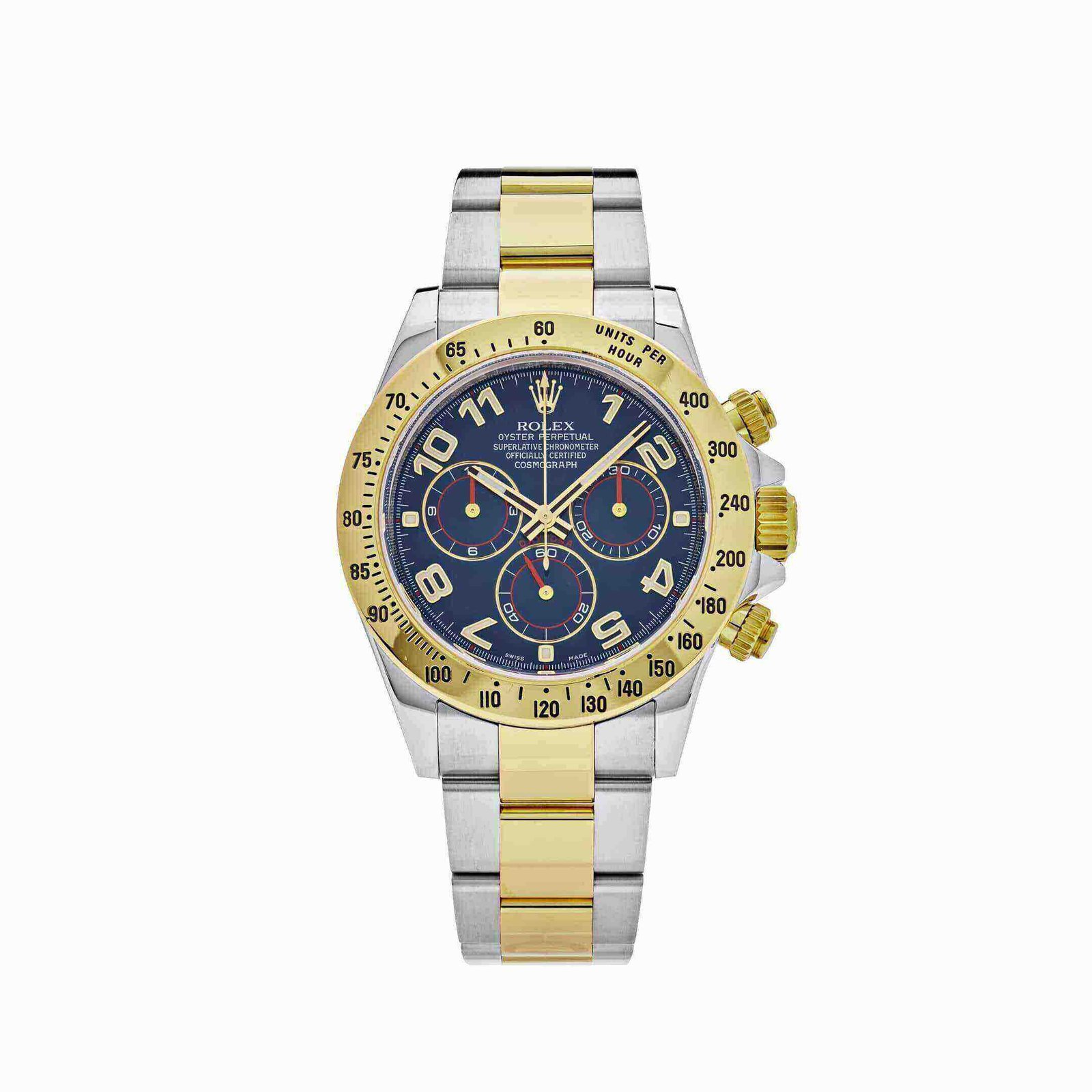 This Rolex Daytona Cosmograph is crafted in a 40mm stainless steel case with a yellow gold fixed bezel ring with Tachymeter scale.The blue dial featuresblue sub-dials with red hands, yellow gold hands and arabic numeral markers. The watch comes on a stainless steel and yellow gold bracelet with folding clasp. This timepiece is available in great pre-owned condition and comes complete with its original box and papers.