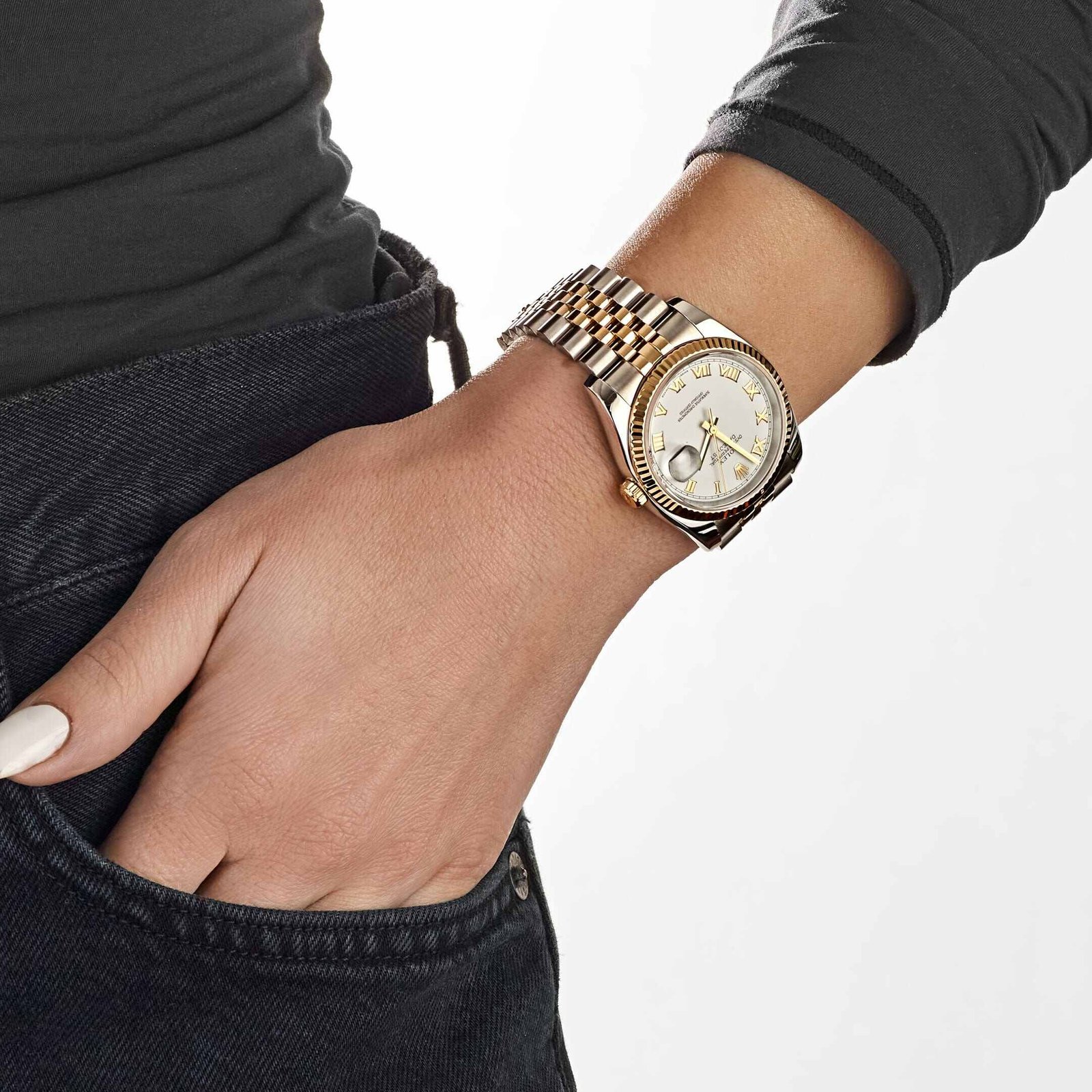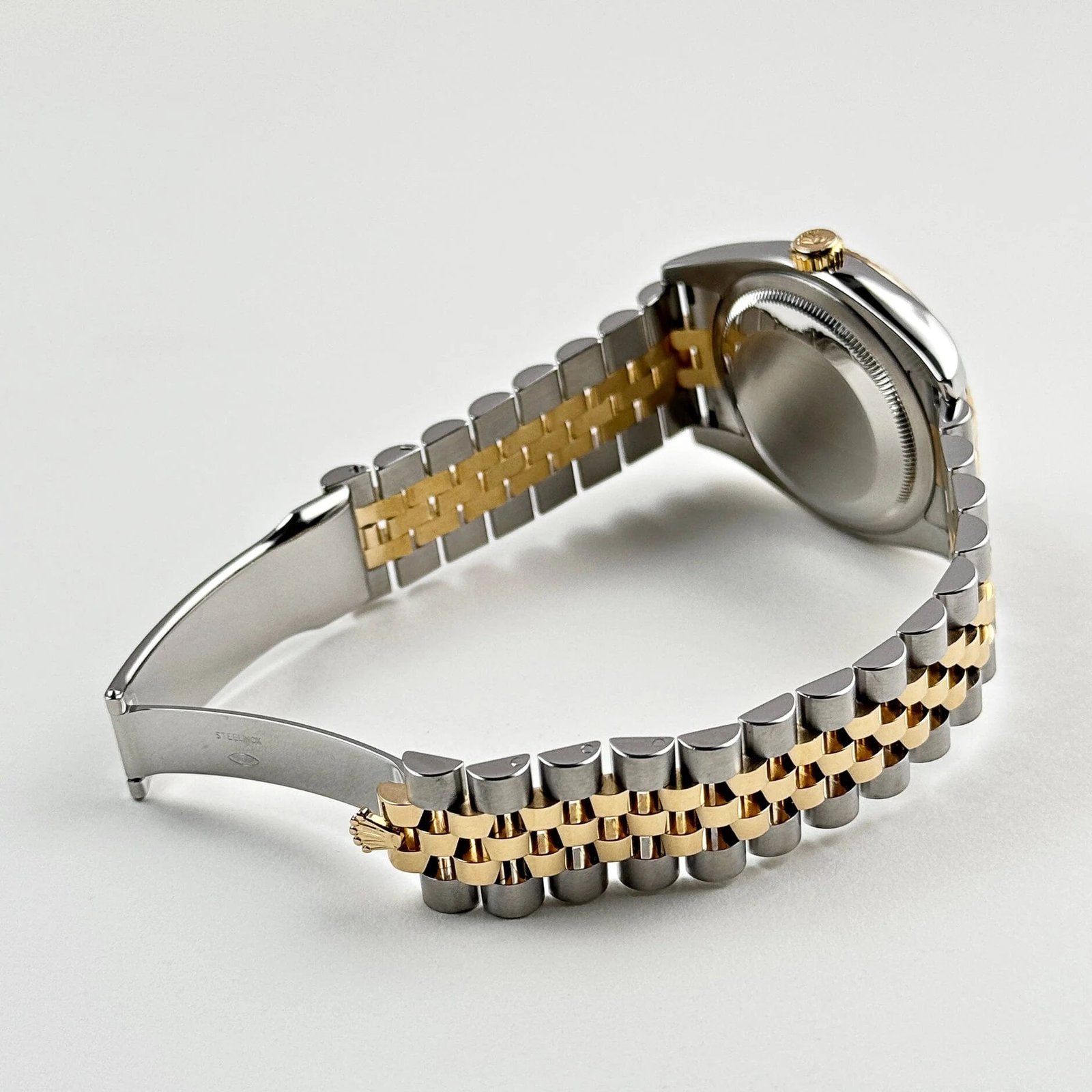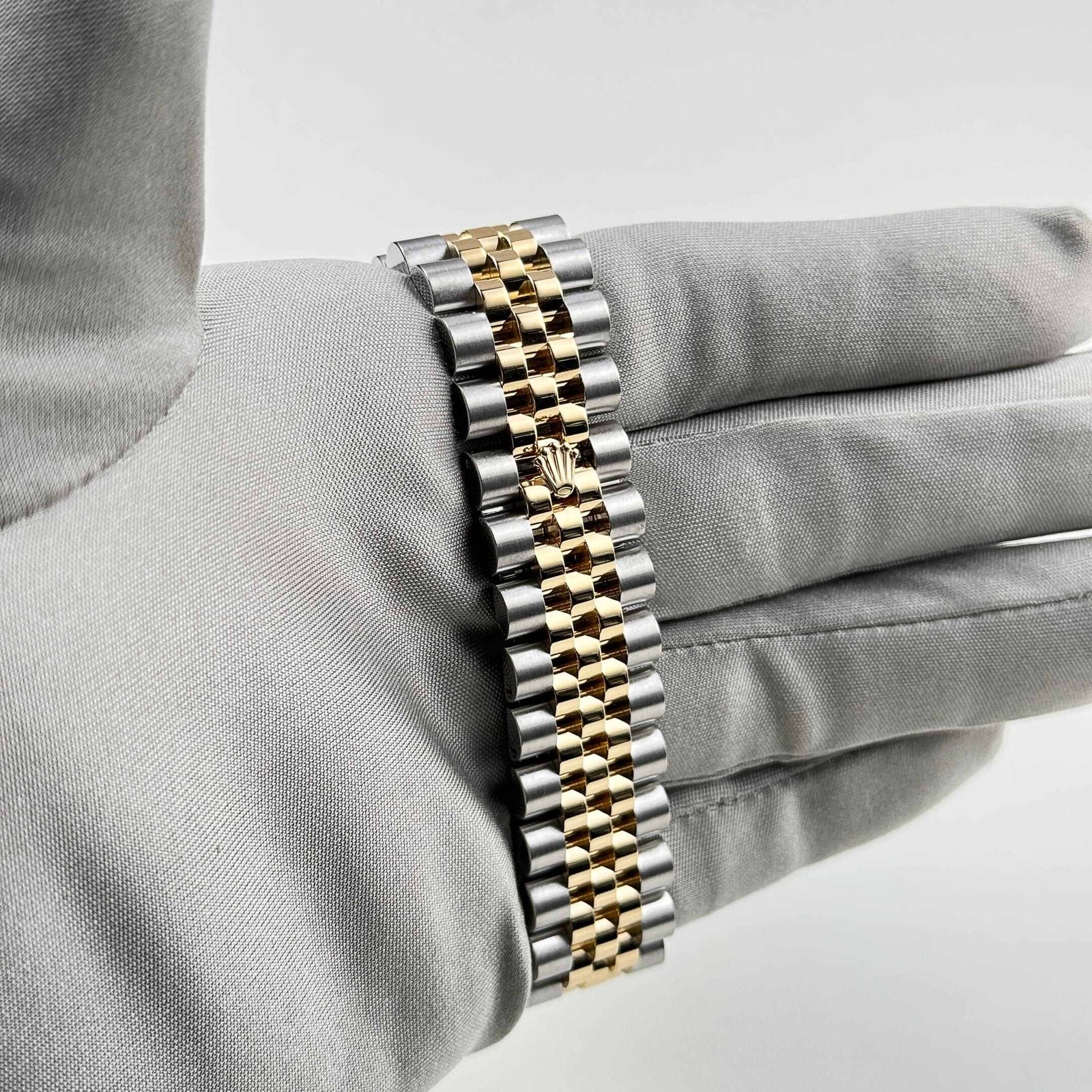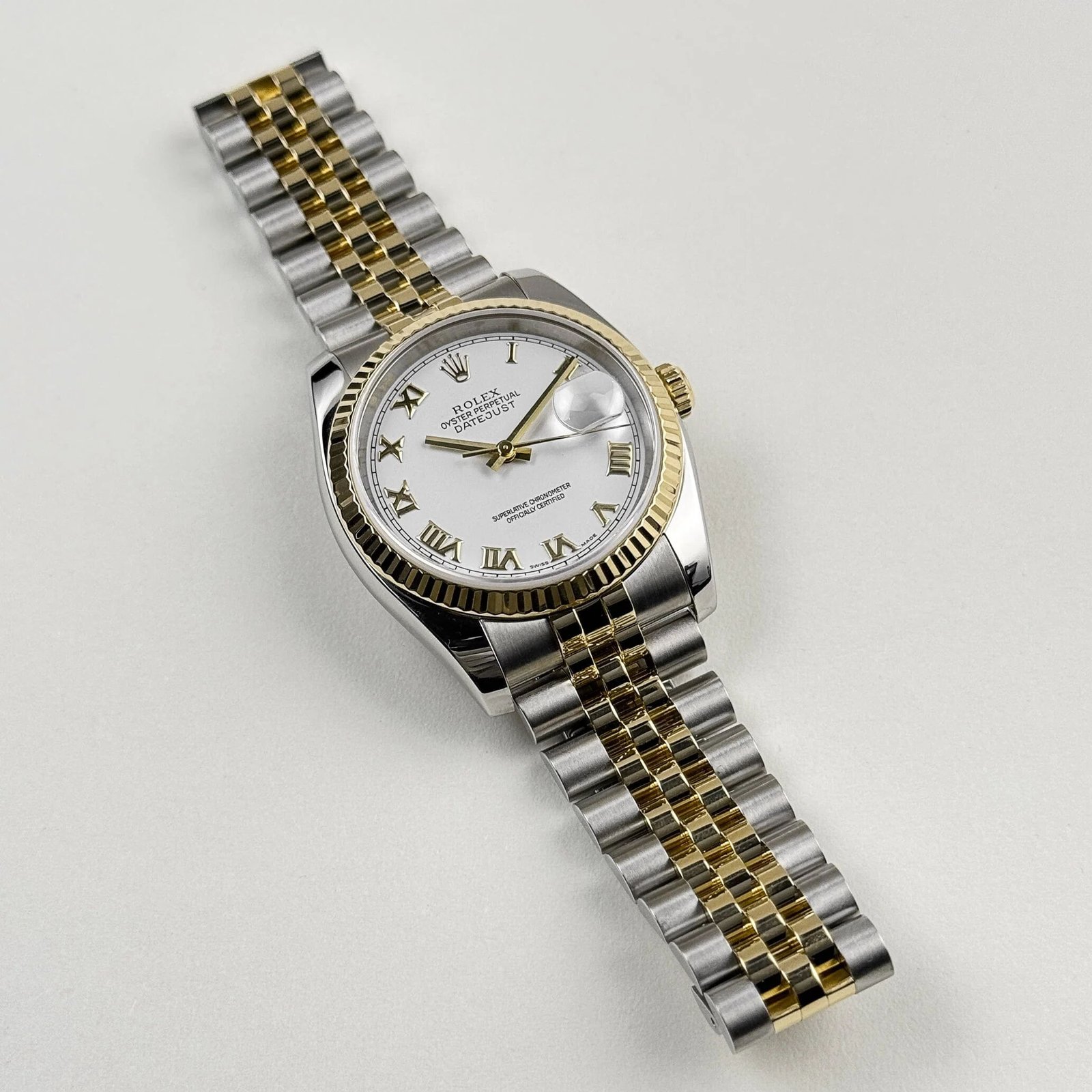 The crisp white dial is adorned with bold Roman numeral hour markers. creating a classic and sophisticated look. The date display at 3 o’clock. magnified by the Cyclops lens. ensures practicality and ease of use. The watch is paired with the Jubilee bracelet. combining comfort with style. featuring yellow gold center links and stainless steel outer links. Powered by the reliable Rolex self-winding movement. the 116233 is a perfect choice for collectors and enthusiasts seeking a versatile. luxurious. and enduring timepiece.