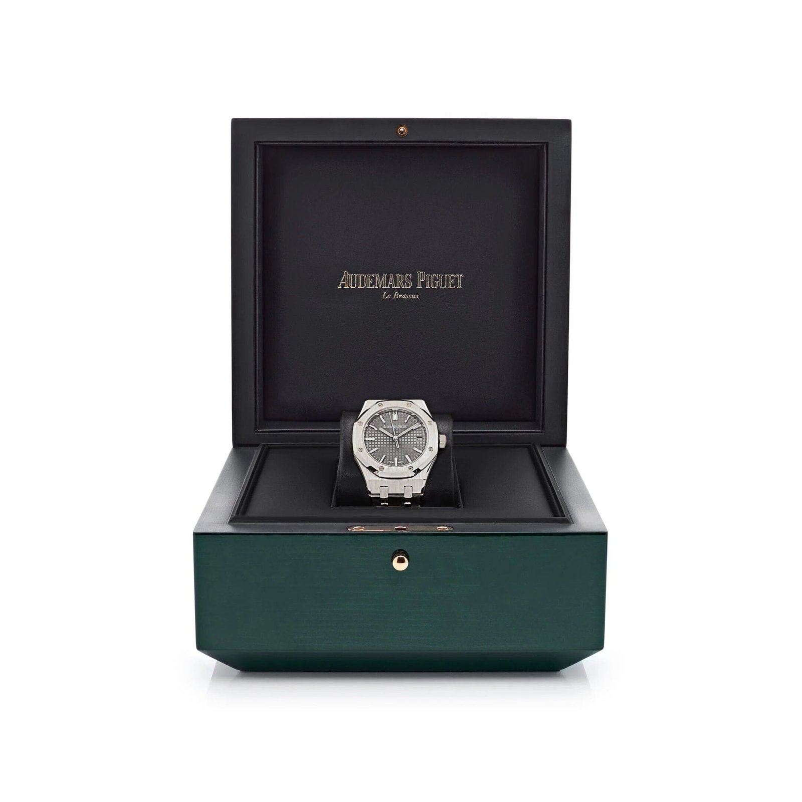 This Royal Oak 15550ST.OO.1356ST.03 ’50th Anniversary’ is crafted in a stainless steel case measuring 37mm. The grey dial features theGrande Tapisserie pattern with white gold applied hour-markers and RoyalOak hands with luminescent coating.