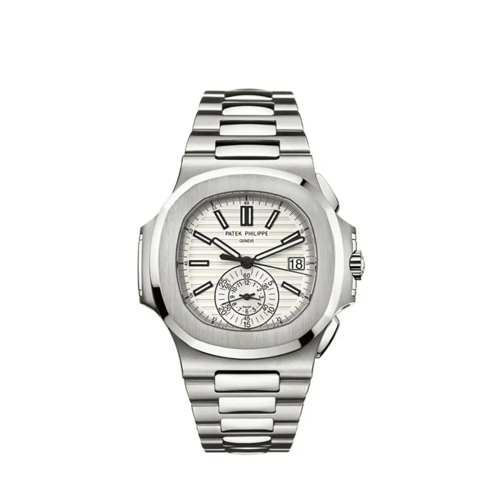 This Patek Philippe Nautilus Chronograph features a 40.5mm stainless steel case with a round octagonal shape and smooth satin-finished bezel. The white dial is protected with a sapphire-crystal and finished with a stainless steel bracelet and fold-over clasp.
