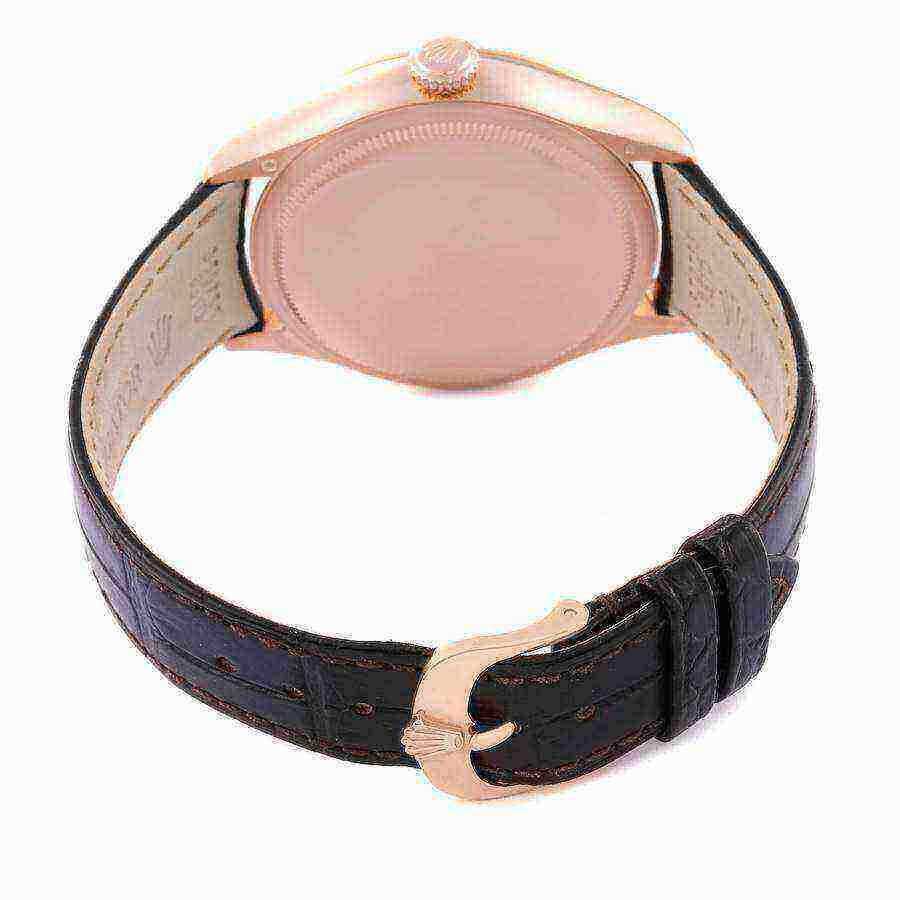 Rolex Cellini Dual Time Rose Gold Automatic Mens Watch 50525 Box Card. Automatic self-winding movement. Officially certified Swiss chronometer (COSC). Paramagnetic blue Parachrom hairspring. Bidirectional self-winding via Perpetual rotor. 18K rose gold round case 39 mm in diameter. Rolex logo on a crown. . Scratch resistant sapphire crystal. Chocolate brown sunburst guilloche dial with raised polished rose gold baton hour markers. Fine printed minute/seconds track. Centre hour, minute, and seconds rose gold hands. Second time zone at 6 o’clock with day/night indicator. Brown alligator leather strap with 18K rose gold tang buckle.