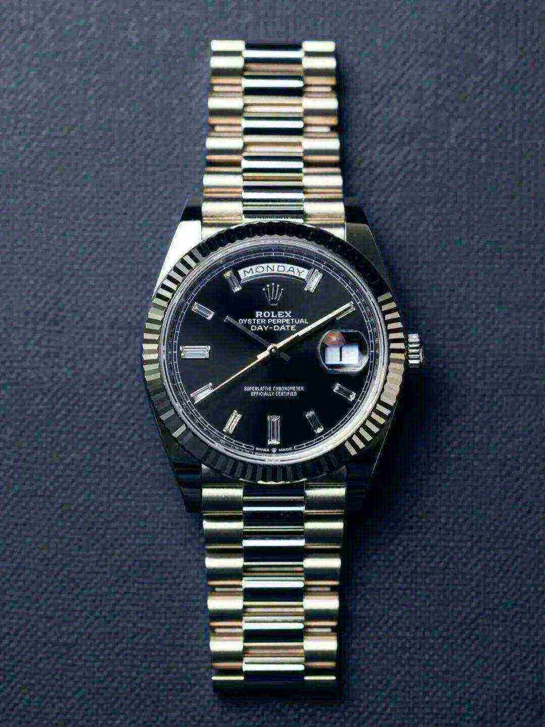 The Oyster Perpetual Day-Date is inlaid in a 40mm 18k white gold case surrounding a black dial with 18 ct gold hour markers. The signature fluted bezel is an aesthetic element and distinctive feature for the Rolex brand. The symbolic 18k white gold presidential bracelet includes semi-circular three-piece links and concealed Crown-clasp.