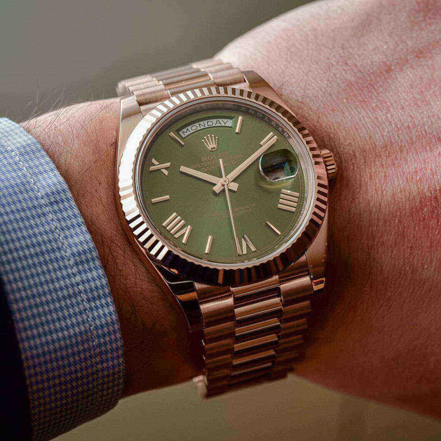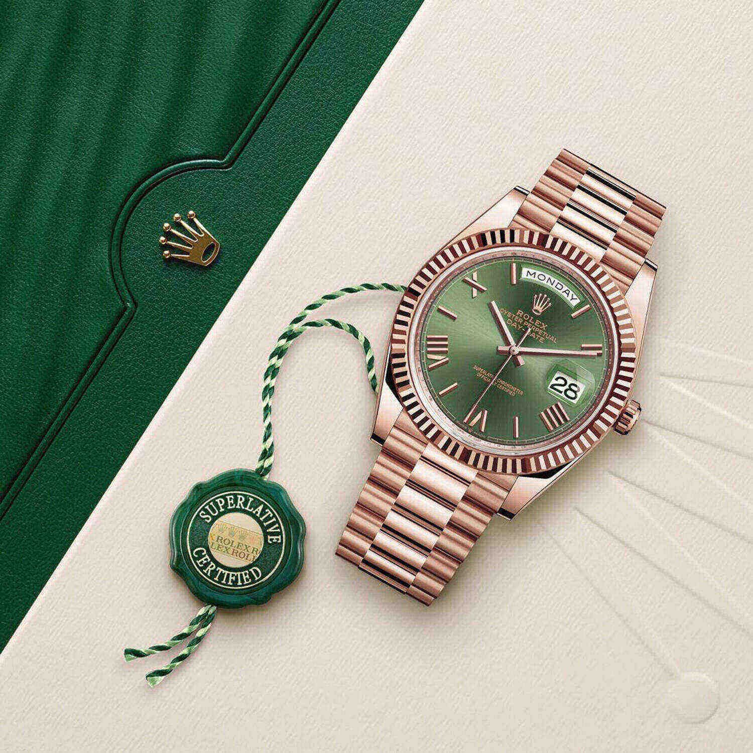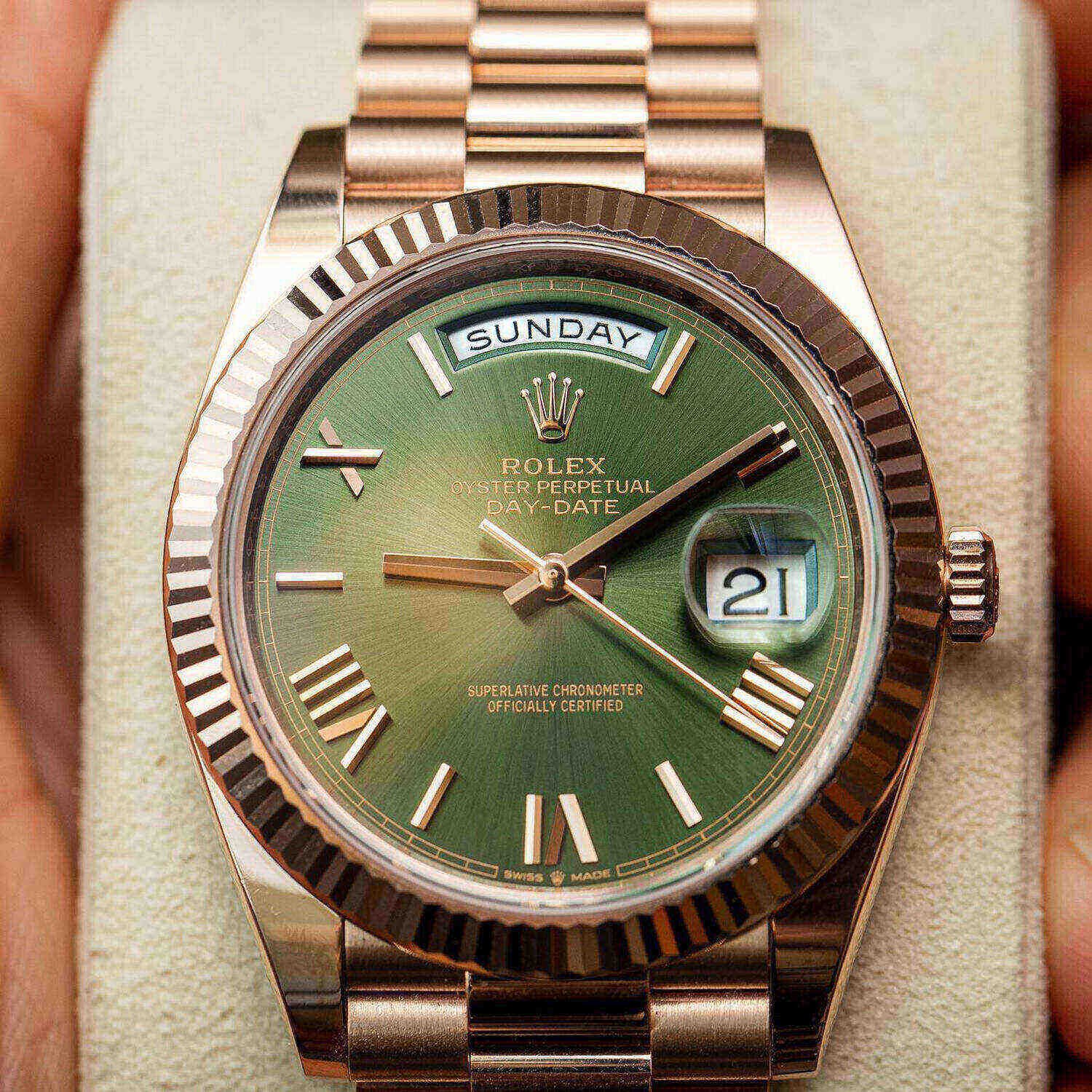 18kt Rose gold case with an 18kt rose gold president bracelet. Fixed fluted 18kt yellow gold bezel. Olive green dial with yellow gold hands and Roman numeral and index hour markers. Minute markers around the outer rim. Dial Type: Analog. Date display at the 3 o’clock position. Day of the week display centered on the 12 o’clock position. Automatic movement. Scratch-resistant sapphire crystal. Screw down crown. Solid case back. Case diameter: 40 mm. Round case shape. Fold-over clasp. Water-resistant at 100 meters / 330 feet. Functions: date, day, hour, minute, second. Luxury watch style. Watch label: Swiss Made.