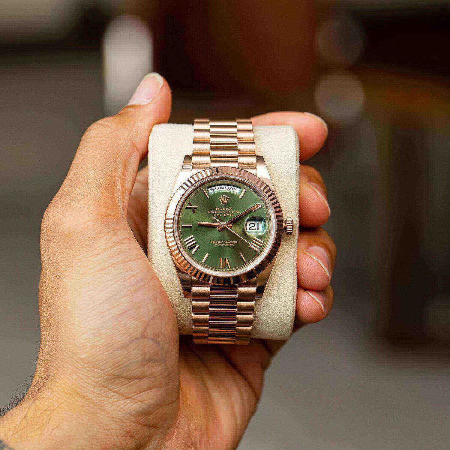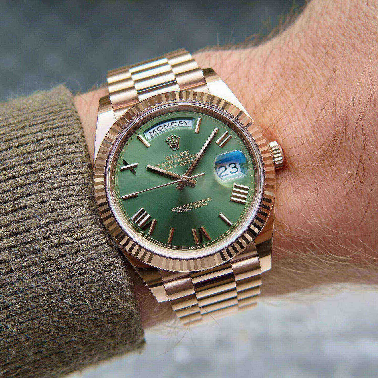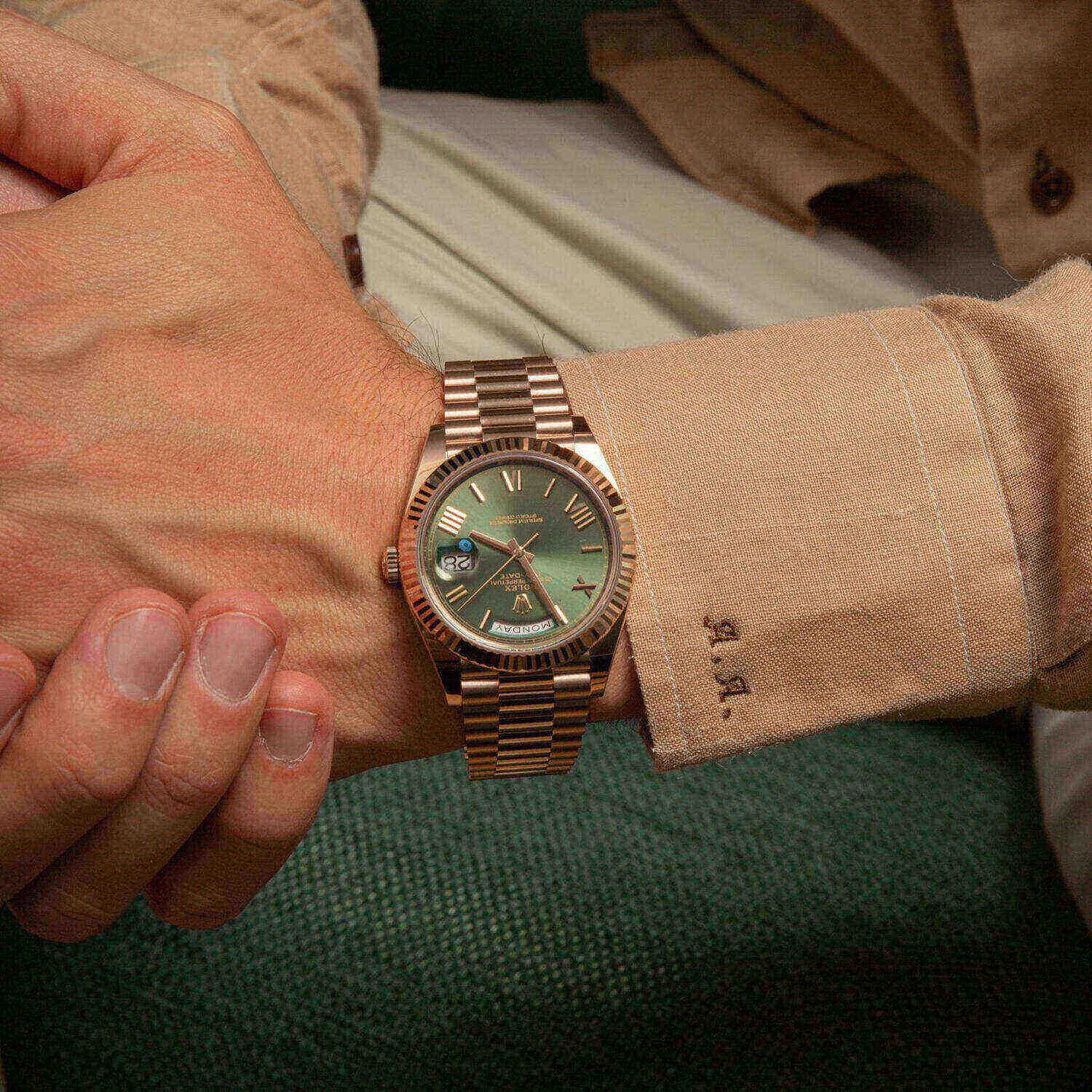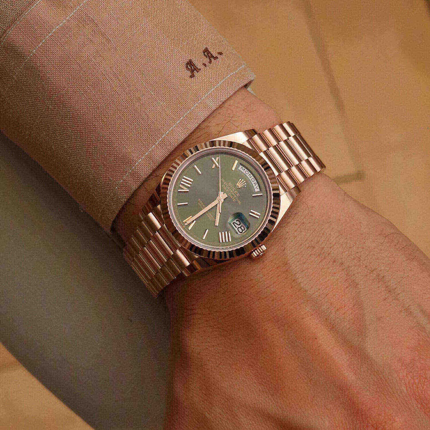 18kt Rose gold case with an 18kt rose gold president bracelet. Fixed fluted 18kt yellow gold bezel. Olive green dial with yellow gold hands and Roman numeral and index hour markers. Minute markers around the outer rim. Dial Type: Analog. Date display at the 3 o’clock position. Day of the week display centered on the 12 o’clock position. Automatic movement. Scratch-resistant sapphire crystal. Screw down crown. Solid case back. Case diameter: 40 mm. Round case shape. Fold-over clasp. Water-resistant at 100 meters / 330 feet. Functions: date, day, hour, minute, second. Luxury watch style. Watch label: Swiss Made.