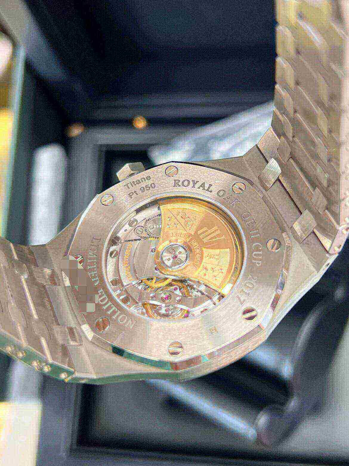 AP Royal Oak Self Winding 41mm Titanium. Limited Edition Watch 15403IP.OO.1220IP.01. 41 mm titanium case. 9.8 mm thick. glareproofed sapphire crystal back engraved with the legend QE II CUP 2017 LIMITED EDITION. polished 950 platinum bezel. glareproofed sapphire crystal. rhodium-toned dial with Grande Tapisserie pattern. white gold applied hour-markers and Royal Oak hands with luminescent coating. Calibre 3120 selfwinding movement with dive-time measurement. hours. minutes. center seconds and date. approximately 60 hours of power reserve. titanium bracelet with polished 950 platinum links. titanium AP folding buckle. Water resistant to 50 meters.