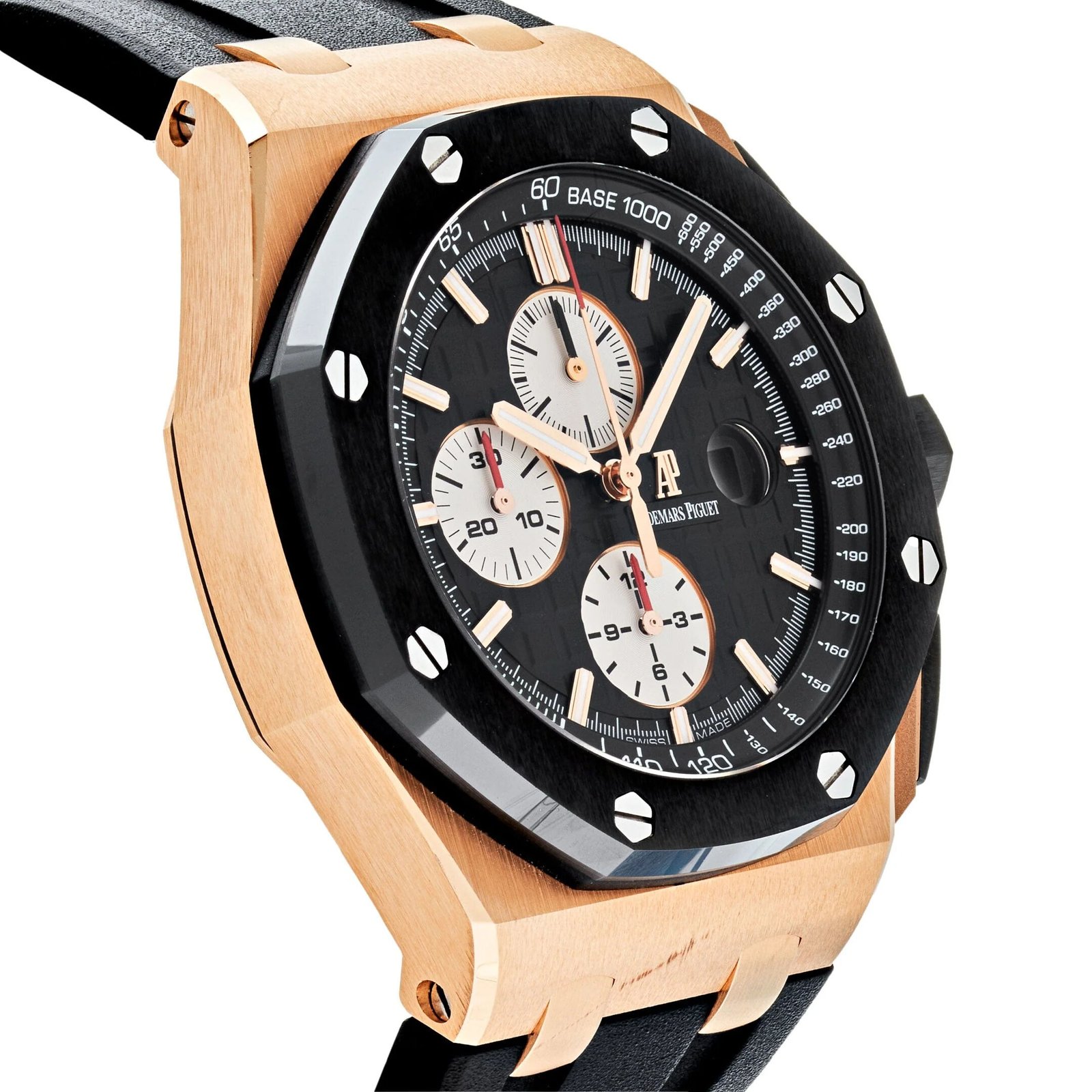 This Royal Oak Offshore is designed with a 44mm 18-carat rose gold case and black ceramic bezel. pushpieces and screw-locked crown with pink gold pushpiece guards. In the center inlays a black ‘Mega Tapisserie’ dial with luminous hands and hour markers featuring white sub-dials. It comes on a black rubber strap with 18-carat gold pin buckle.