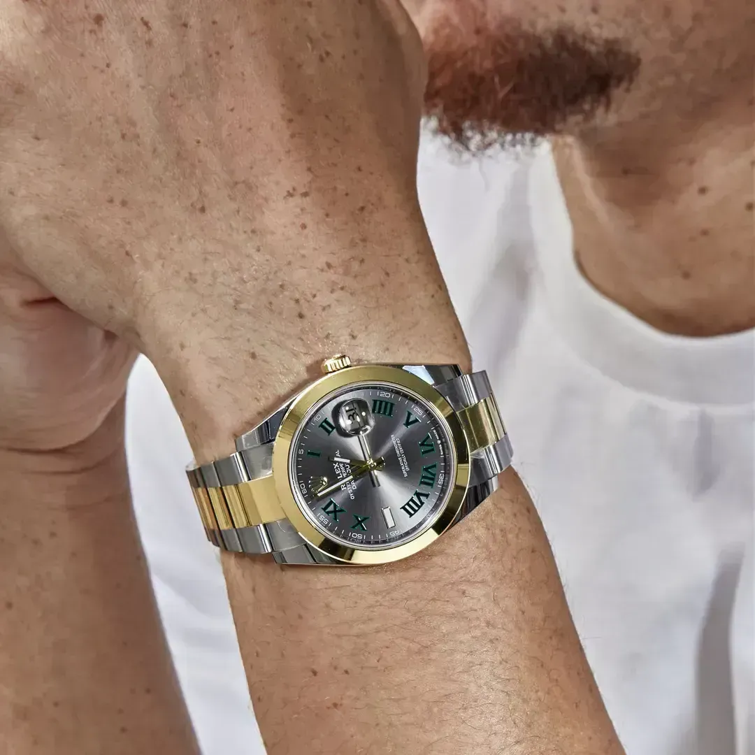 This Rolex Datejust 126303 is designed with a 41mm two-toned 18k yellow gold and stainless steel case, slate dial, and styled on a two-toned Oyster bracelet. Roman numeral hour markers in green are representative of the famous Wimbledon court, where luxury and sports make the perfect match.