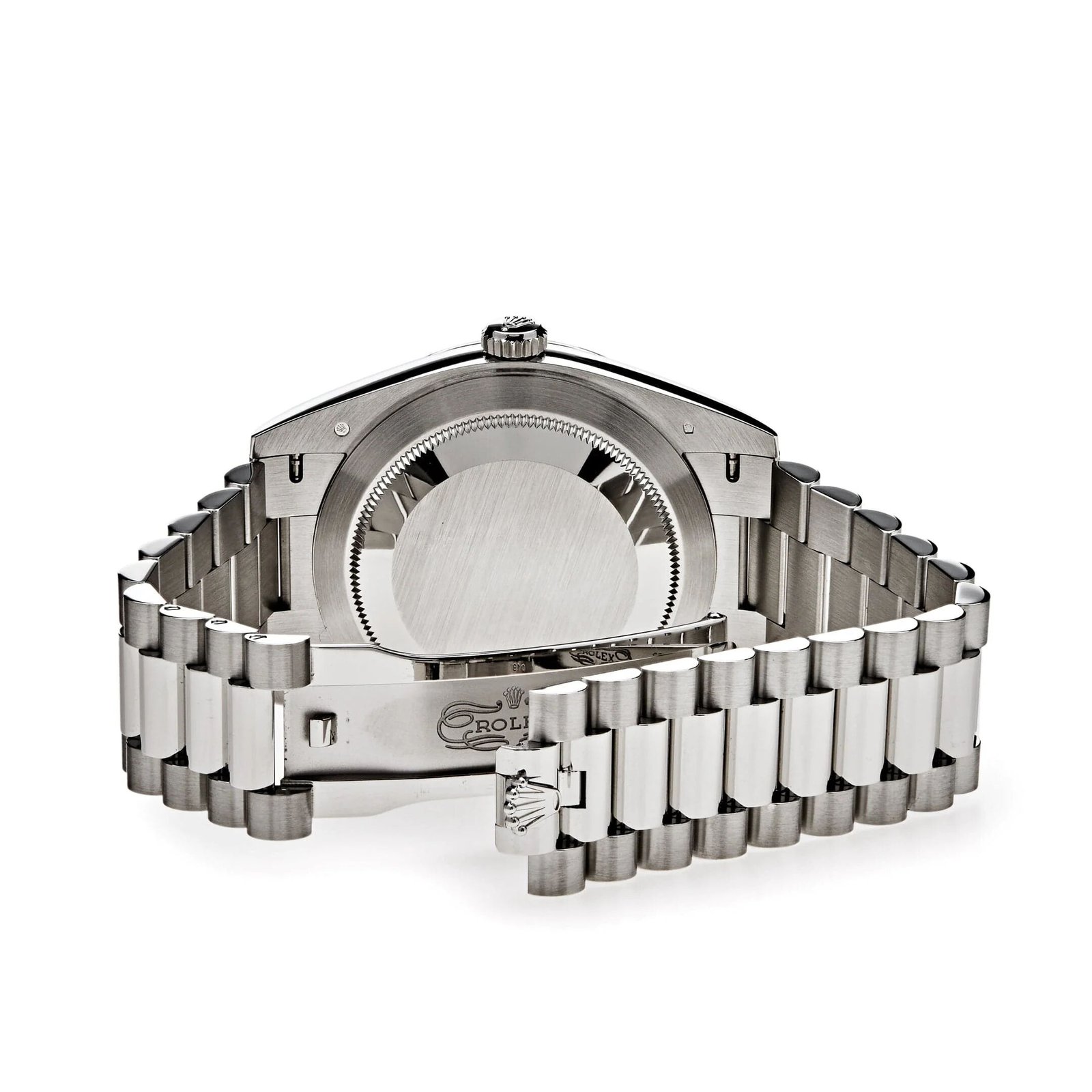 The Rolex Presidential Day-Date 40mm is inlaid in platinum, surrounding an olive green dial with roman numeral hour markers, a scratch-proof sapphire crystal-smooth platinum bezel and automatic movement. The signature Presidential bracelet is made of platinum and includes, semi-circular three-piece links and embodies excellence and charm.