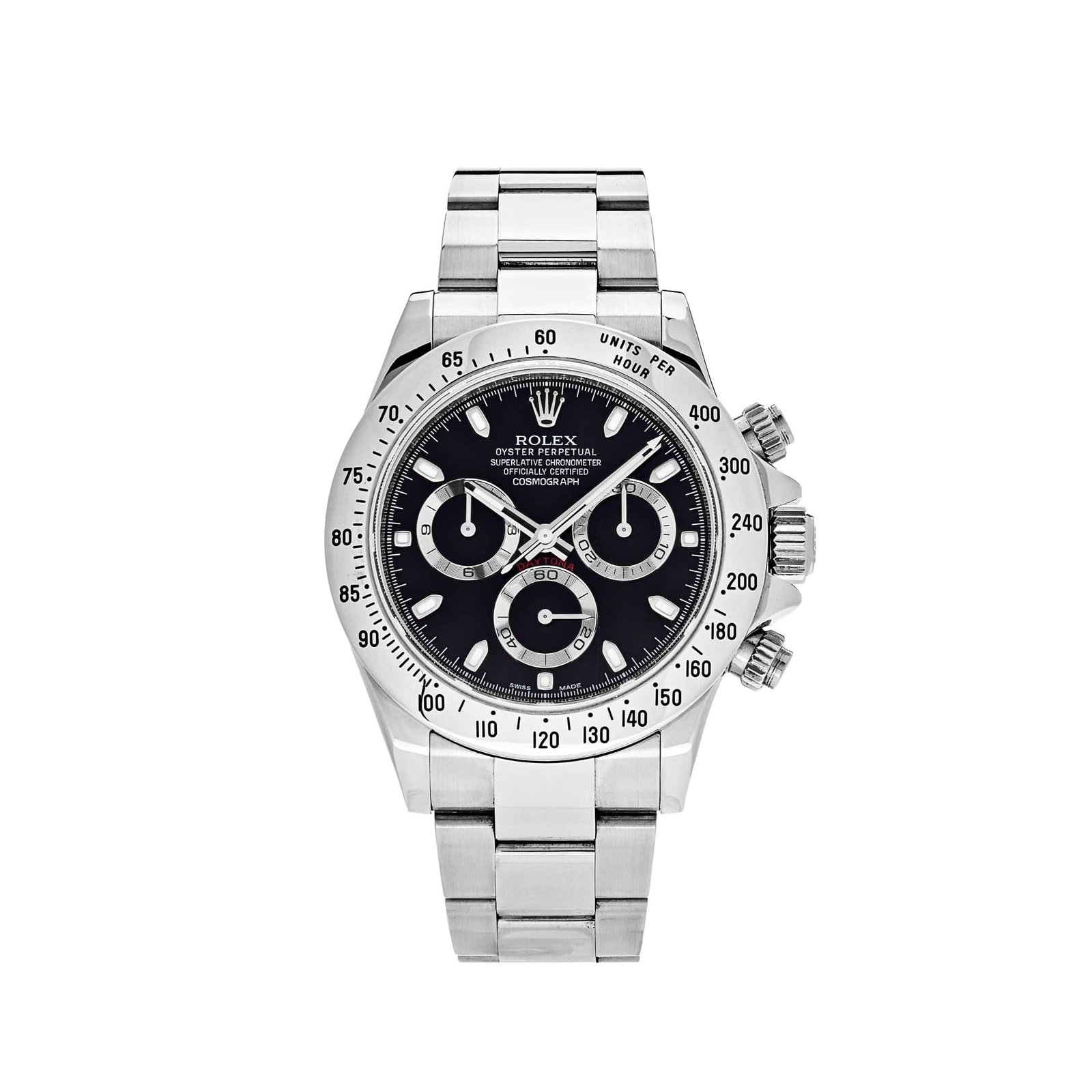 Crafted from durable stainless steel. the 116520 is designed to withstand the rigors of everyday wear while maintaining its refined look. Its 40mm case and polished Oyster bracelet ensure a comfortable fit. while the tachymeter bezel enhances its motorsport-inspired aesthetic. With its distinctive styling and impressive functionality. the Rolex Daytona 116520 remains a true symbol of luxury. performance. and craftsmanship.