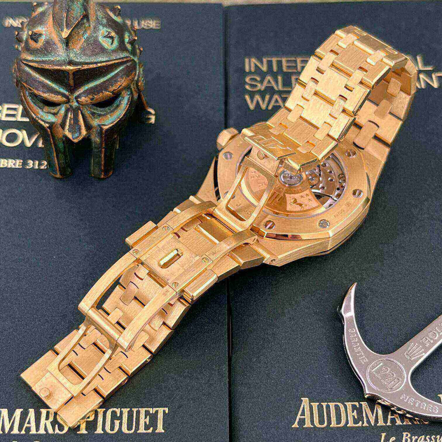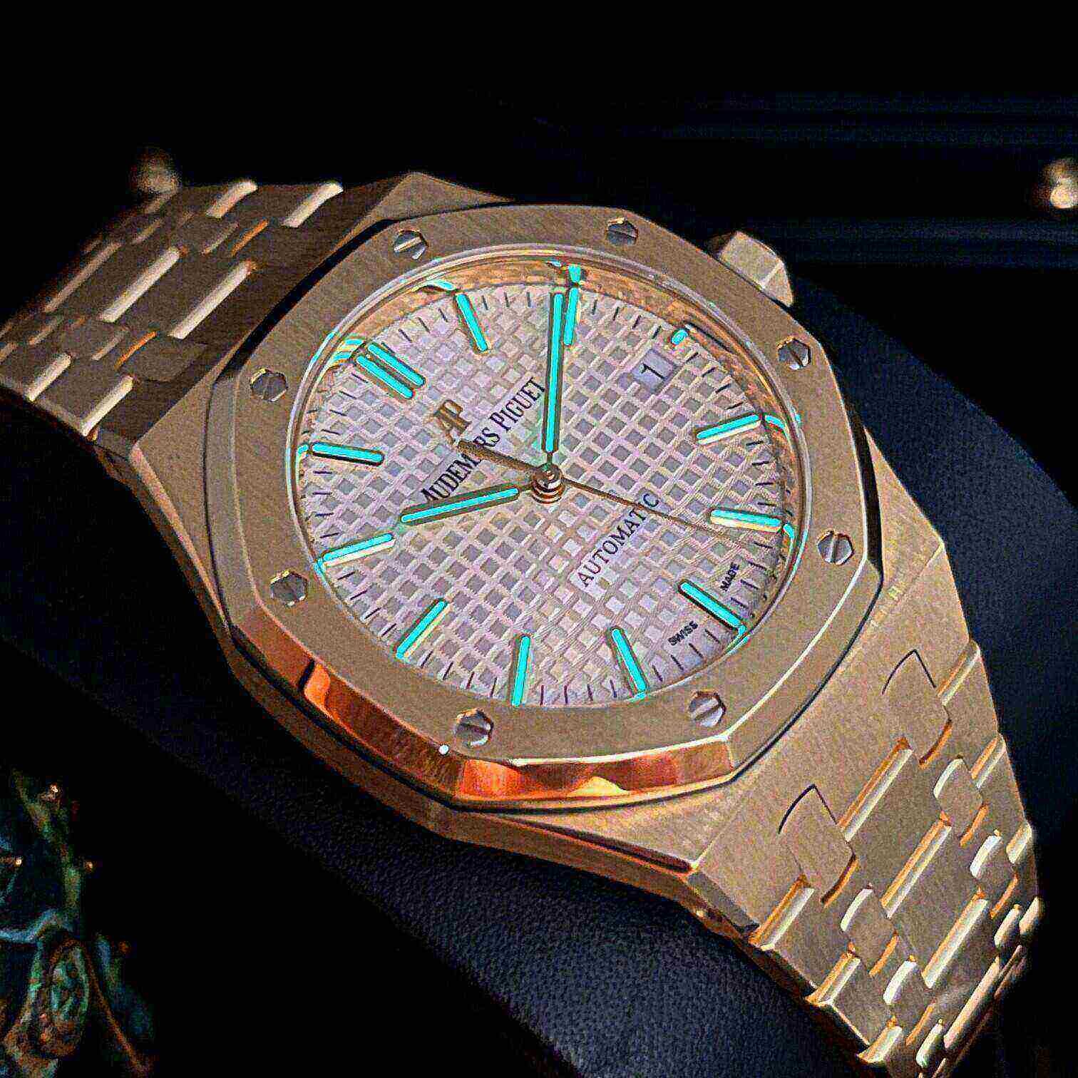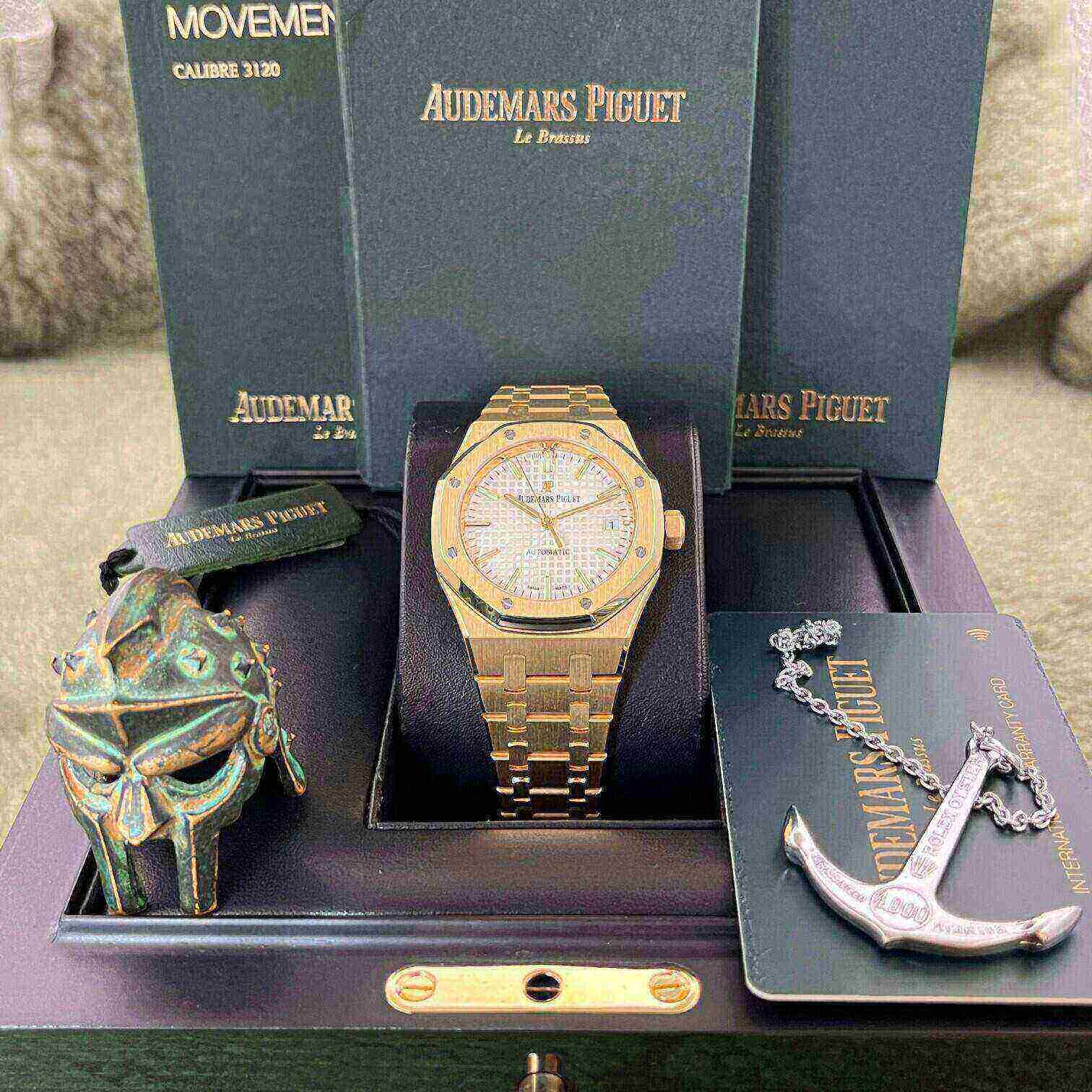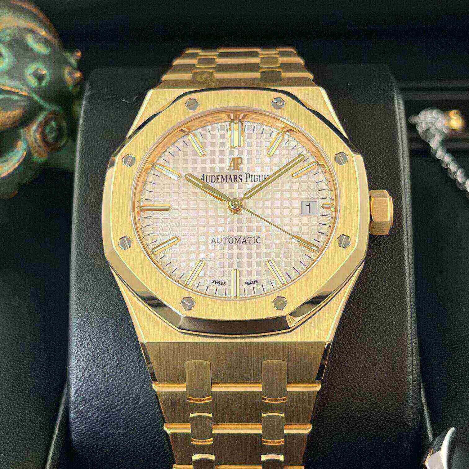 AP Royal Oak Selfwinding. Silver dial. 37mm. Yellow gold. 15450BA.OO.1256BA.01. 37 mm 18K yellow gold case. 9.8 mm thick. glareproofed sapphire crystal back. screw-locked crown. glareproofed sapphire crystal. silver-toned dial with Grande Tapisserie pattern. yellow gold applied hour-markers and Royal Oak hands with luminescent coating. Calibre 3120 selfwinding movement with dive-time measurement. hours. minutes. center seconds and date. approximately 60 hours of power reserve. 18K yellow gold bracelet. AP folding buckle. Water resistant to 50 meters