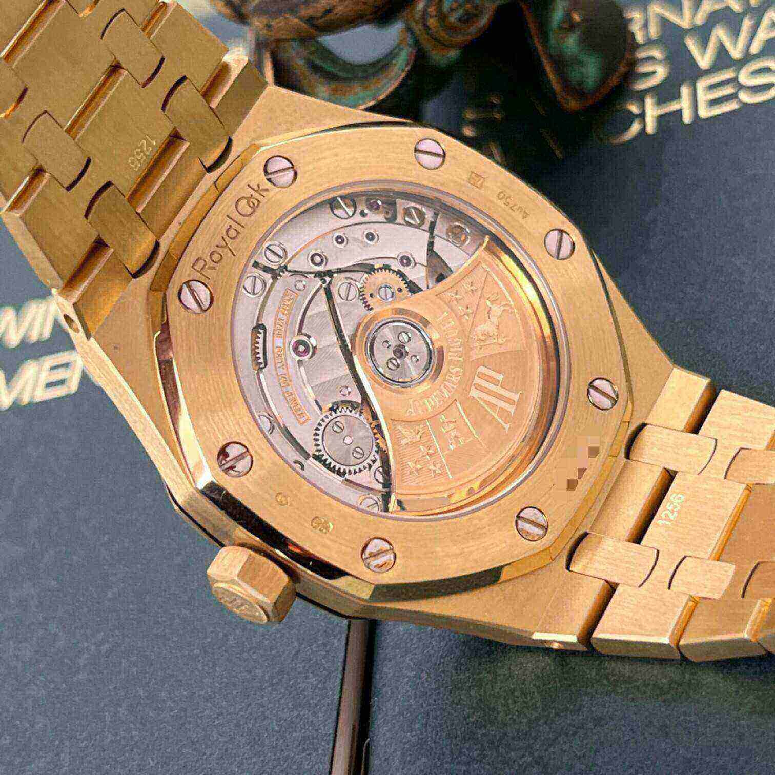 Dial: Silver-toned dial with Grande Tapisserie pattern. Yellow gold applied hour-markers and Royal Oak hands with luminescent coating