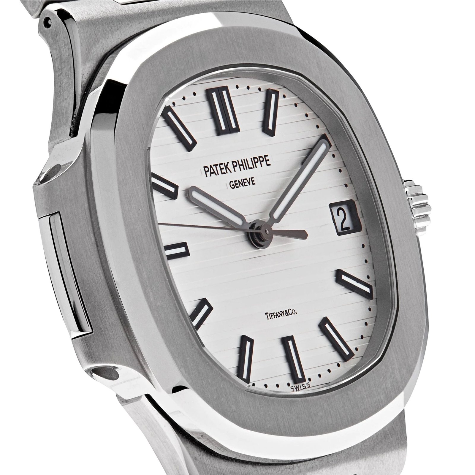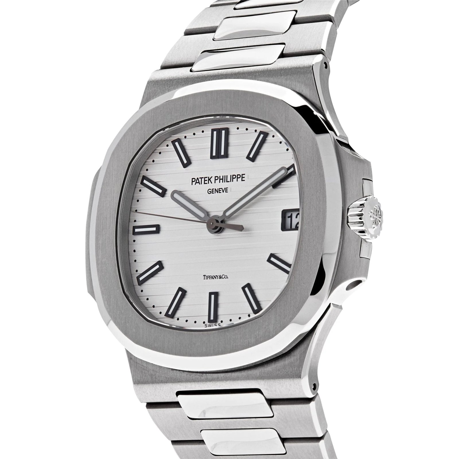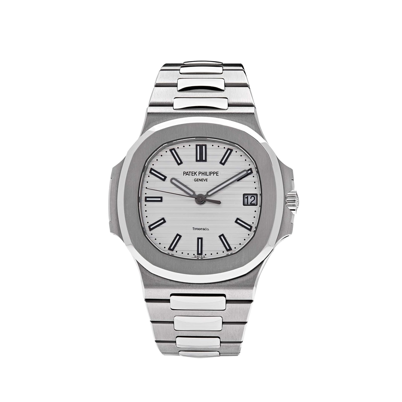 The Patek Philippe Nautilus features a 40mm x 38mm stainless steel case surrounding an embossed white dial with the Tiffany & Co. logo. The highly recognizable design of the case. bezel and bracelet are enhanced by a subtle alternation between satinated and polished manual finishing. It is finished on a stainless steel bracelet and fold-over clasp.
