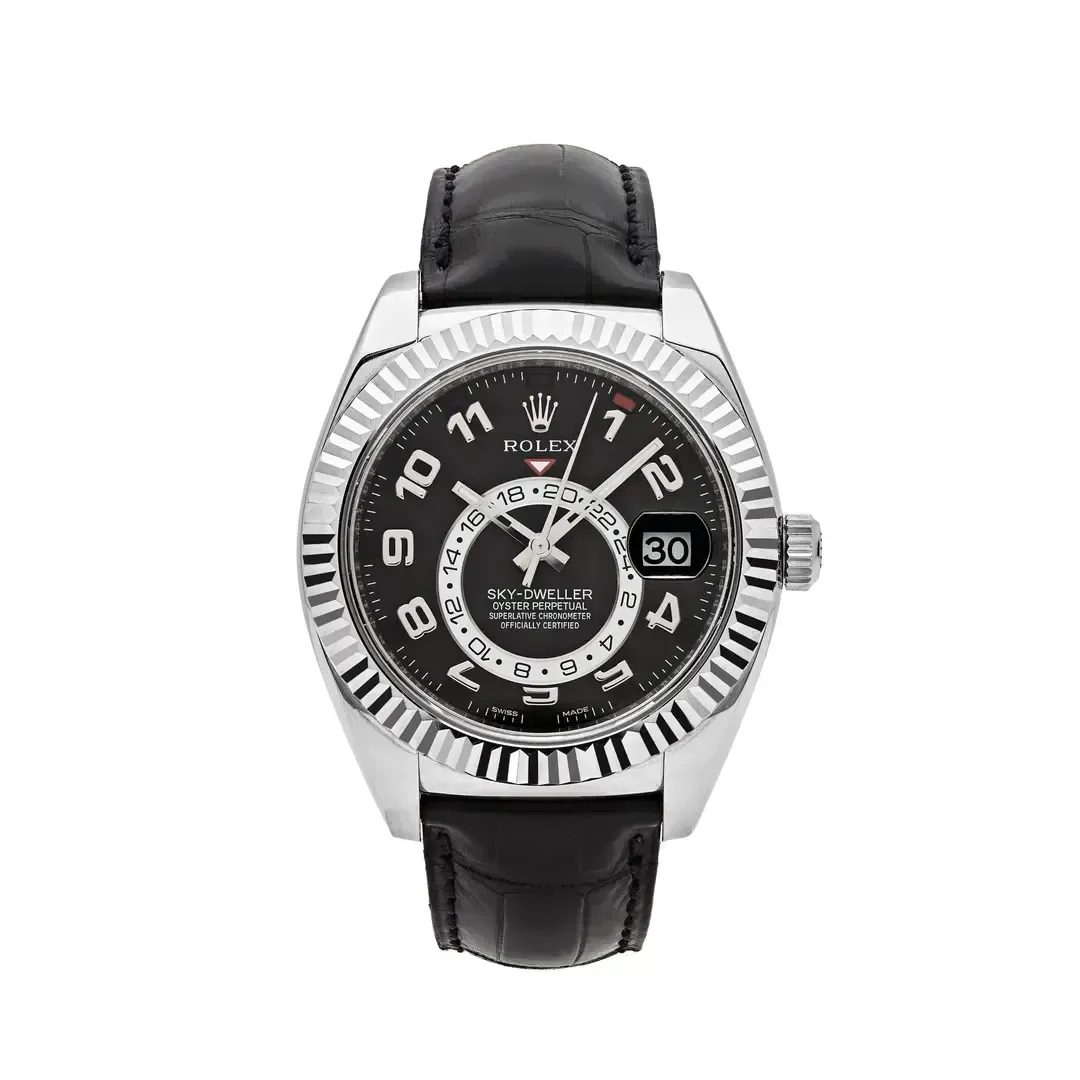 This Rolex Sky-Dweller is inlaid in_a 42mm 18k white gold case and fluted bezel._The Ring Command bezel can be rotated to select the date, the local time and the reference time, which can then be adjusted in either direction using the winding crown. The black dial features the date,_local time, and the second time zone or reference time is displayed on a rotating 24-hour disc. This beauty is housed on a black alligator strap with oysterclasp to ensure style and comfort.